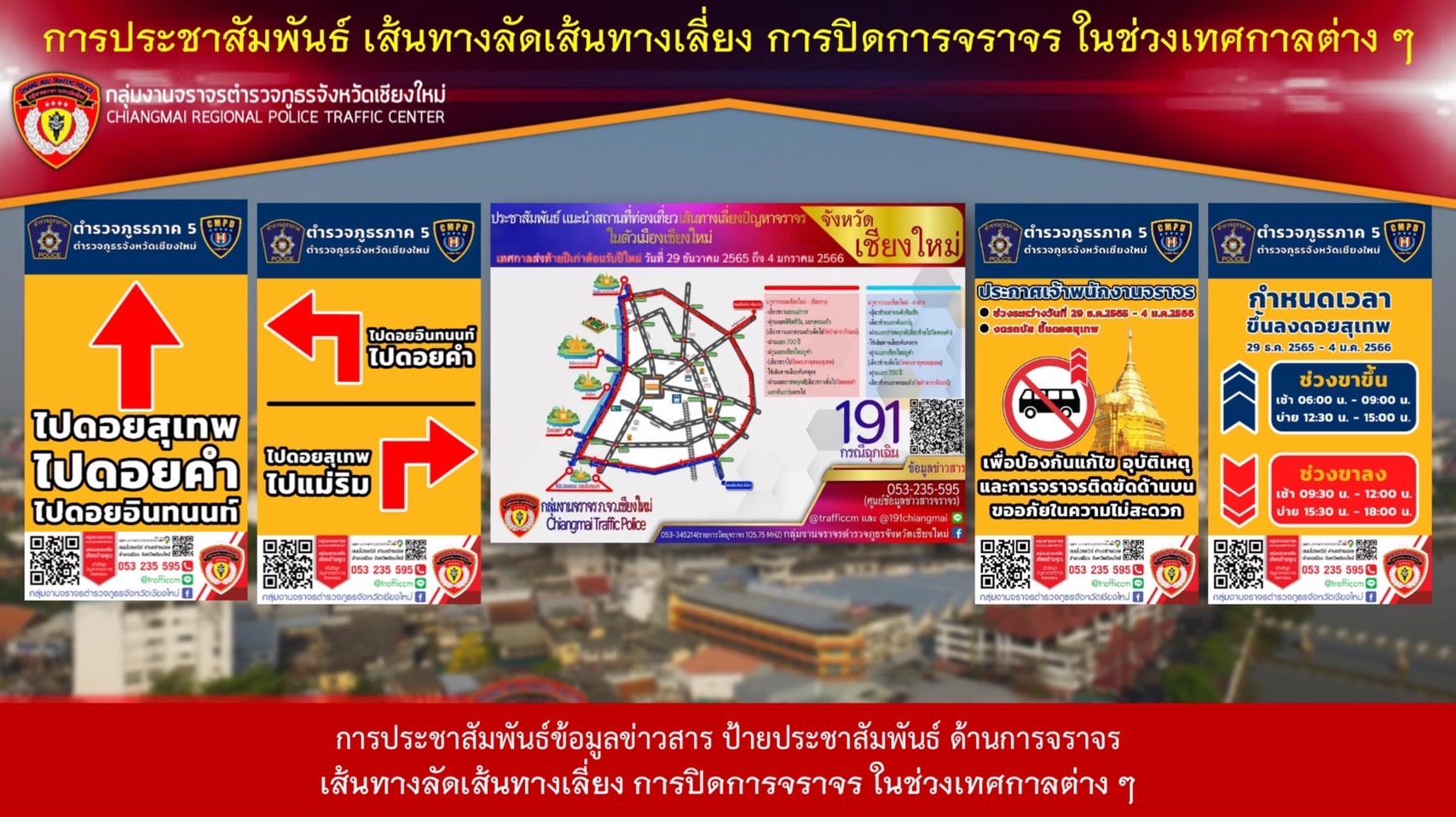 ตำรวจภูธรภาค 5 ,ตํารวจภูธรจังหวัดเชียงใหม่ และกลุ่มงานจราจรตํารวจภูธรจังหวัดเชียงใหม่ พร้อมอํานวยความสะดวกและมาตรการกํากับดูแลความปลอดภัยทางถนน ในช่วงเทศกาลปีใหม่ พ.ศ. 2566 ในระหว่างวันที่ 29 ธันวาคม 2565 ถึงวันที่ 4 มกราคม 2566 ซึ่งเป็นช่วงเทศกาลส่งท้ายปีเก่า-ต้อนรับปีใหม่ 2566 รัฐบาลได้มีการประกาศเป็นวันหยุดยาว ประกอบกับเป็นเทศกาลท่องเที่ยวของจังหวัดเชียงใหม่ จะมีนักท่องเที่ยวหลั่งไหลเข้าสู่จังหวัดเชียงใหม่จํานวนมาก มาท่องเที่ยวจับจ่ายซื้อของตามสถานที่ท่องเที่ยวสําคัญและการเดินทางของประชาชนเพื่อกลับภูมิลําเนา โดยใช้รถส่วนตัวหรือรถโดยสารสาธารณะอย่างหนาแน่น