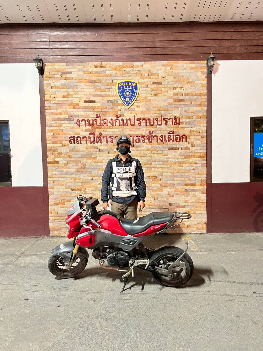 ผลการปฏิบัติ ตรวจยึดจักรยานยนต์ ฮอนด้า msx สีแดง ดัดแปลงสภาพ,ไม่มีสำเนาคู่มือรถมาแสดง ไม่ติดป้ายภาษี จำนวน 1 คัน นำส่ง พงส.สภ.ช้างเผือก ดำเนินคดีตามกฎหมายต่อไป