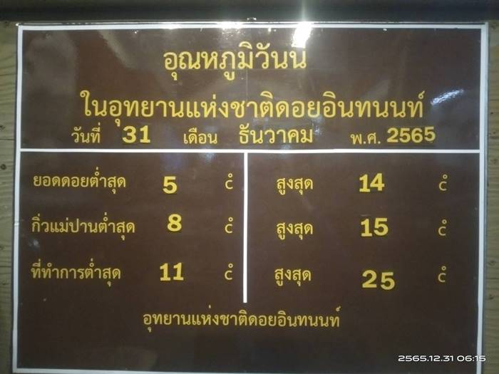 เมื่อเวลา 08.50 น. วันที่ 31 ธ.ค. 65 ทางอุทยานแห่งชาติดอยอินททนนท์ อ.จอมทองเชียงใหม่ โดย นายเกรียงไกร ไชยพิเศษ หัวหน้าอุทยานฯ ได้รายงานมาว่า ที่ดอยอินทนนท์อากาศหนาวเย็น อุณหภูมิเช้านี้ที่ยอดดอยวัดได้ 5 องศา ที่กิ่วแม่ปานวัดได้ 8 องศา ที่จุดทำการอุทยานฯ วัดได้ 11 องศา วันนี้หมอกลง ไม่มีเหมยขาบ