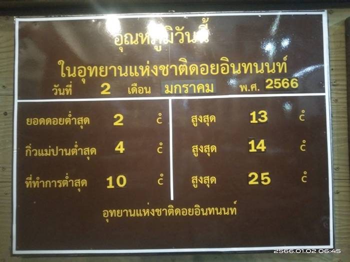 เมื่อเวลา 08.00 น. วันที่ 2 ม.ค. 66 บรรยากาศการท่องเที่ยวภาคเหนือยังคงคึกคักเป็นอย่างมาก โดยเฉพาะดอยอินทนนท์ วันนี้อากาศหนาวจัดถึงขั้นมีเหมยขาบโผล่ให้เห็นตามยอดดอย กิ่งไม้ ดอกไม้ ยอดหญ้าขาวโพลนเต็มไปหมด ทำให้นักท่องเที่ยวตื่นตาตื่นใจที่พบเห็นพากันถ่ายรูปเก็บไว้เป็นที่ระลึก โดยเฉพาะอุณหภูมิ ใกล้ที่จะติดลบแล้ว เหลือต่ำสุด 2 องศาฯ ที่ยอดดอย กิ่วแม่ปาน 4 องศาฯ และอุทยานที่ทำการ 10 องศาฯ นับว่าหนาวเย็นมาก
