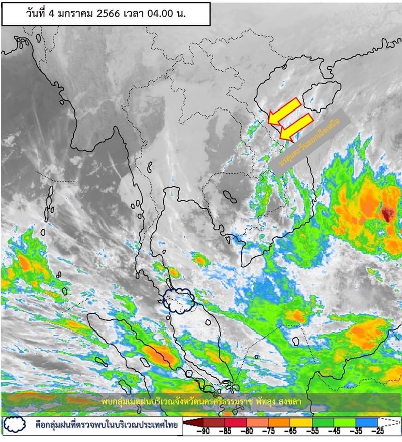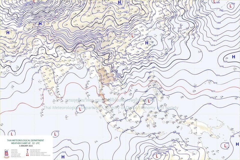 อนึ่ง ในช่วงวันที่ 5 – 8 มกราคม 2566 หย่อมความกดอากาศต่ำบริเวณทะเลจีนใต้ตอนล่าง มีแนวโน้มจะมีกำลังแรงขึ้น และเคลื่อนเข้าใกล้ปลายแหลมญวณ ประกอบกับมรสุมตะวันออกเฉียงเหนือ ที่พัดปกคลุมอ่าวไทยและภาคใต้จะมีกำลังแรงขึ้น ทำให้ในช่วงวันที่ 6 – 8 มกราคม 2566 บริเวณภาคใต้มีฝนเพิ่มมากขึ้นและมีฝนตกหนักถึงหนักมากบางแห่ง ขอให้ประชาชนบริเวณภาคใต้ ระวังอันตรายจากฝนตกหนักถึงหนักมากและฝนตกสะสม ซึ่งอาจทำให้เกิดน้ำท่วมฉับพลันและน้ำป่าไหลหลาก โดยเฉพาะพื้นที่ลาดเชิงเขาใกล้ทางน้ำไหลผ่านและพื้นที่ลุ่มไว้ด้วย สำหรับคลื่นลมบริเวณอ่าวไทยจะมีกำลังแรง โดยมีคลื่นสูง 2 – 4 เมตร บริเวณที่มีฝนฟ้าคะนองคลื่นสูงมากกว่า 4 เมตร ขอให้ชาวเรือเดินเรือด้วยความระมัดระวัง หลีกเลี่ยงบริเวณที่มีฝนฟ้าคะนอง และเรือเล็กบริเวณอ่าวไทย ควรงดออกจากฝั่งในช่วงเวลาดังกล่าว รวมทั้งระวังอันตรายจากคลื่นลมแรงที่ซัดเข้าหาฝั่งไว้ด้วย