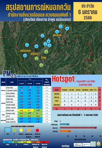 🌏☁️📢 สรุปสถานการณ์ฝุ่น PM2.5 ประจำวันที่ 6 มกราคม 2566 ในพื้นที่รับผิดชอบของสำนักงานสิ่งแวดล้อมและควบคุมมลพิษที่ 1 (เชียงใหม่ เชียงราย ลำพูน แม่ฮ่องสอน)