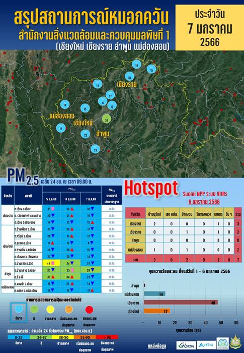 🌏☁️📢 สรุปสถานการณ์ฝุ่น PM2.5 ประจำวันที่ 7 มกราคม 2566 ในพื้นที่รับผิดชอบของสำนักงานสิ่งแวดล้อมและควบคุมมลพิษที่ 1 (เชียงใหม่ เชียงราย ลำพูน แม่ฮ่องสอน)