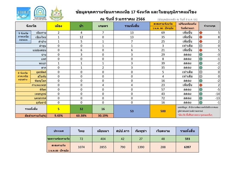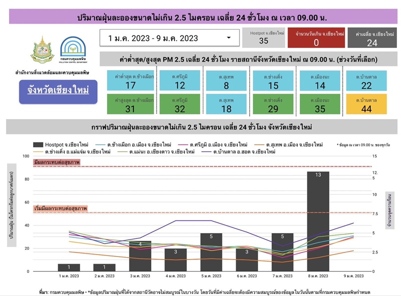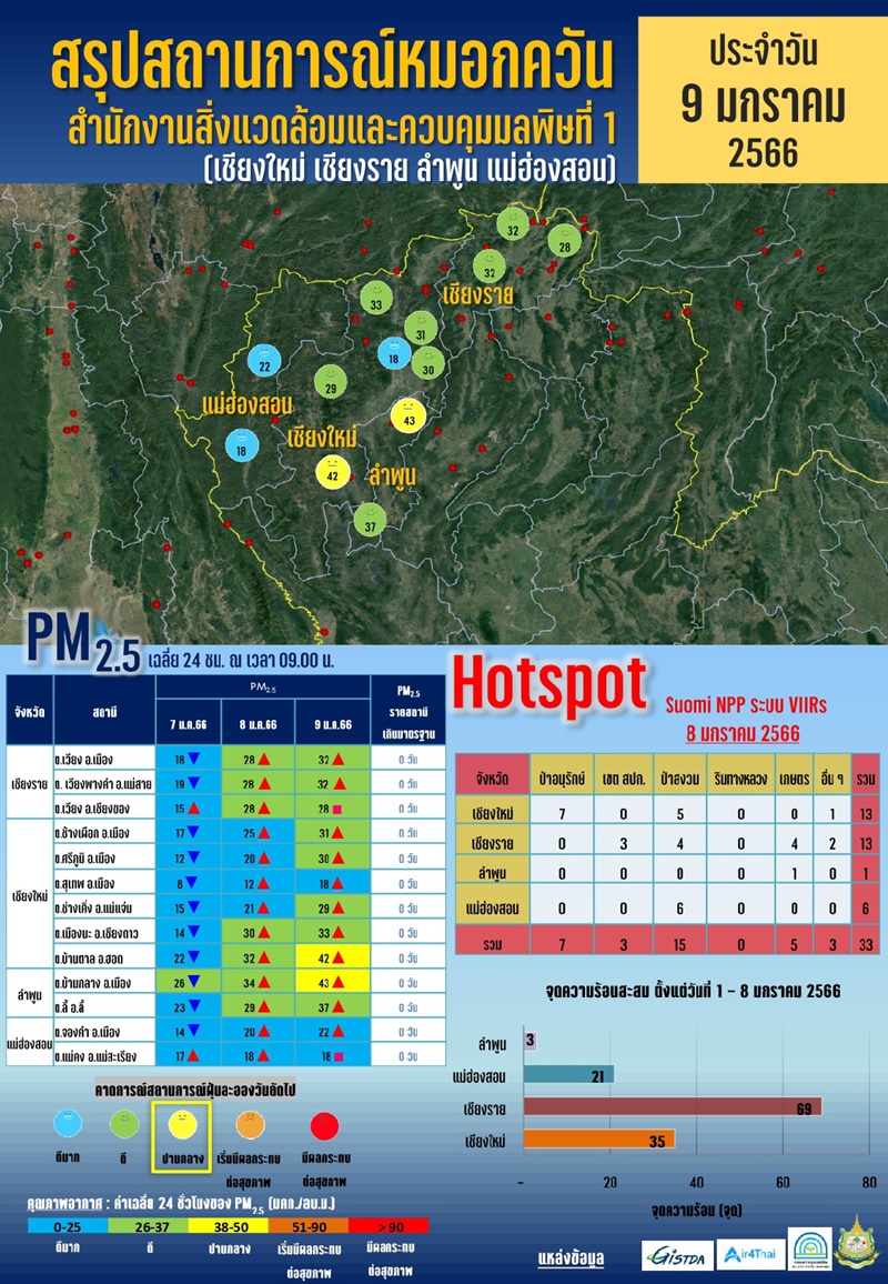 สรุปสถานการณ์ฝุ่น PM2.5 ประจำวันที่ 9 มกราคม 2566 ในพื้นที่รับผิดชอบของสำนักงานสิ่งแวดล้อมและควบคุมมลพิษที่ 1 (เชียงใหม่ เชียงราย ลำพูน แม่ฮ่องสอน)