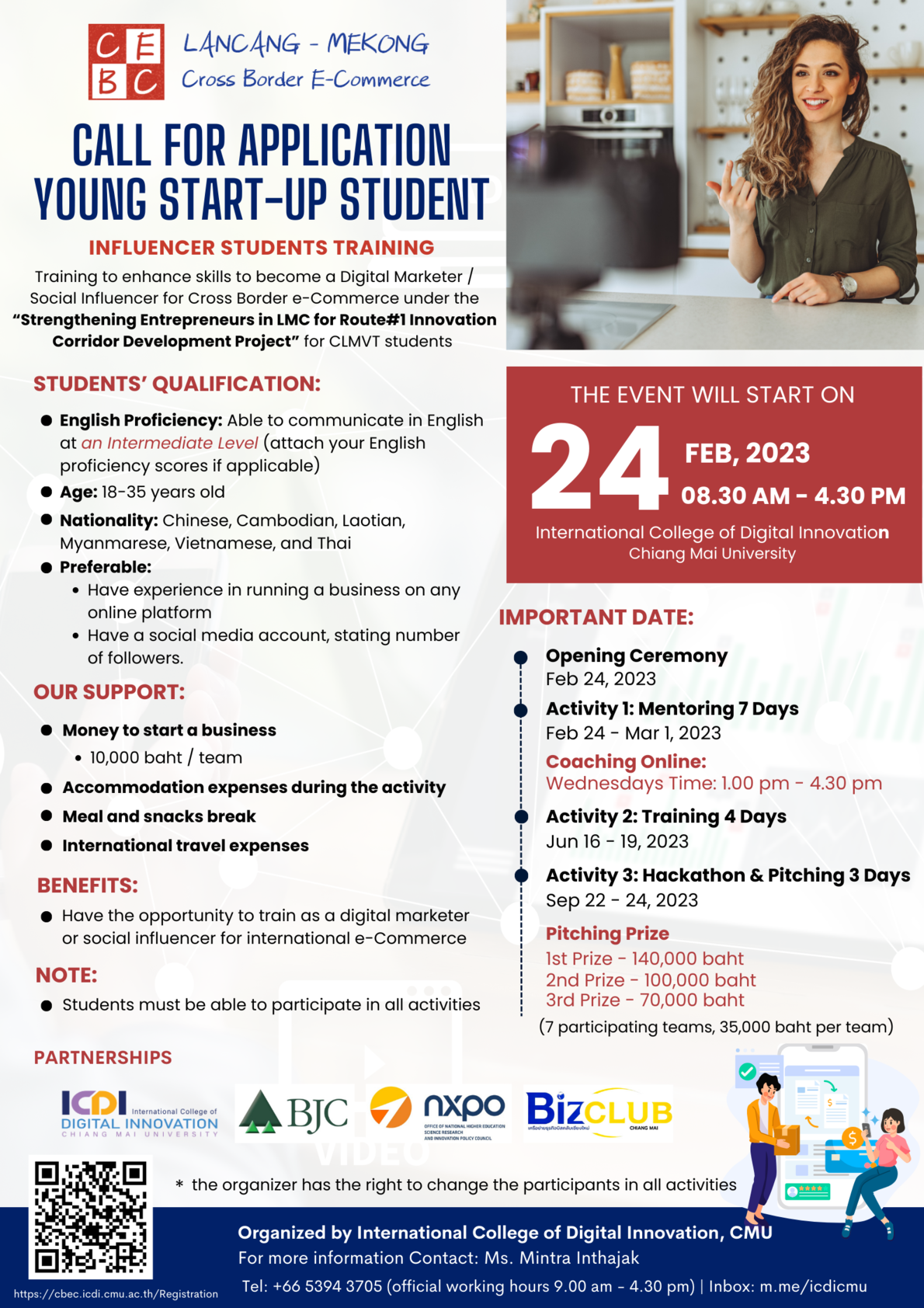 วิทยาลัยนานาชาตินวัตกรรมดิจิทัล (ICDI-CMU) และ สำนักงานสภานโยบายการอุดมศึกษา วิทยาศาสตร์ วิจัยและนวัตกรรมแห่งชาติ (สอวช.)ขอเชิญผู้ประกอบการ เข้าร่วม “การฝึกอบรมผู้ประกอบการนวัตกรรมดิจิทัล (SMEs, Startup นักการตลาดดิจิทัล) ในการนำสินค้าและบริการเข้าสู่ตลาด Cross Border E-Commerce ในประเทศจีน” ภายใต้โครงการพัฒนาศักยภาพและยกระดับการส่งออกผลิตภัณฑ์ของผู้ประกอบการในพื้นที่ล้านช้างแม่โขงตามเส้นทาง Route Number 1
