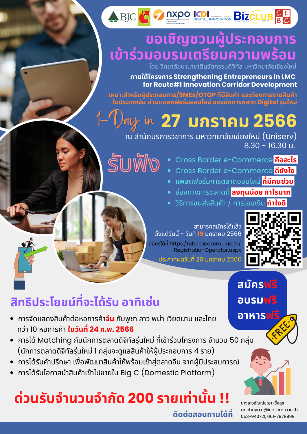 วิทยาลัยนานาชาตินวัตกรรมดิจิทัล (ICDI-CMU) และ สำนักงานสภานโยบายการอุดมศึกษา วิทยาศาสตร์ วิจัยและนวัตกรรมแห่งชาติ (สอวช.)ขอเชิญผู้ประกอบการ เข้าร่วม “การฝึกอบรมผู้ประกอบการนวัตกรรมดิจิทัล (SMEs, Startup นักการตลาดดิจิทัล) ในการนำสินค้าและบริการเข้าสู่ตลาด Cross Border E-Commerce ในประเทศจีน” ภายใต้โครงการพัฒนาศักยภาพและยกระดับการส่งออกผลิตภัณฑ์ของผู้ประกอบการในพื้นที่ล้านช้างแม่โขงตามเส้นทาง Route Number 1