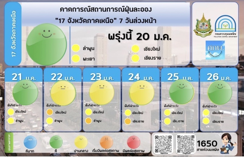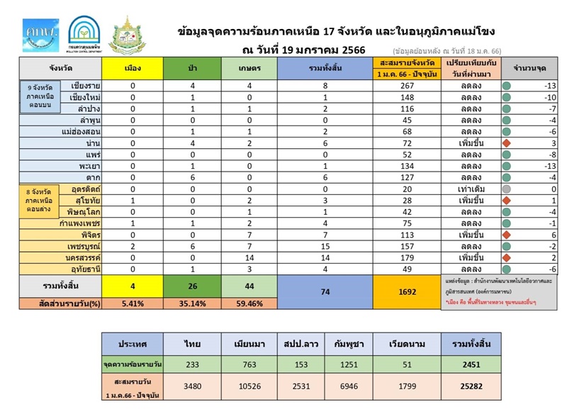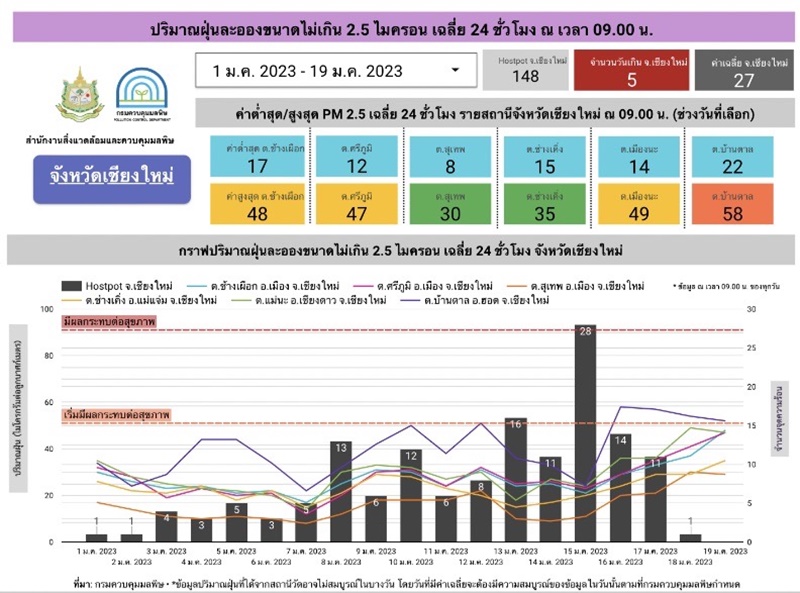 สรุปสถานการณ์ฝุ่น PM2.5 ประจำวันที่ 19 มกราคม 2566 ในพื้นที่รับผิดชอบของสำนักงานสิ่งแวดล้อมและควบคุมมลพิษที่ 1 (เชียงใหม่ เชียงราย ลำพูน แม่ฮ่องสอน)