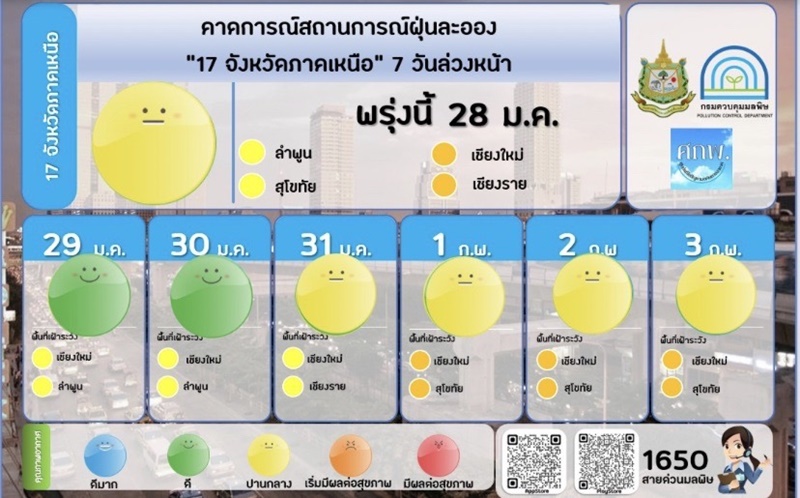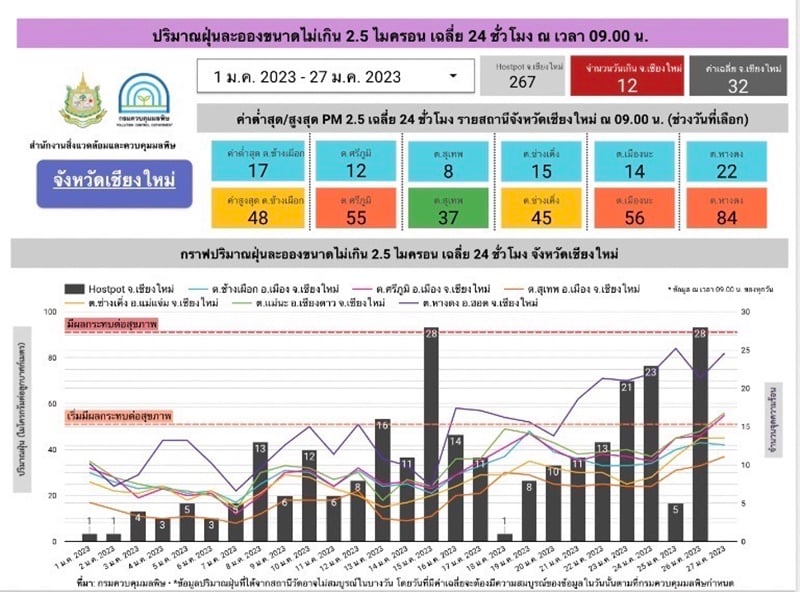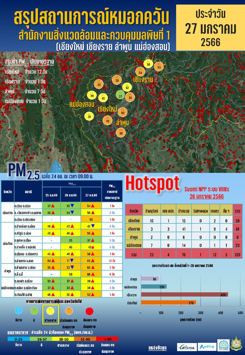สรุปสถานการณ์ฝุ่น PM2.5 ประจำวันที่ 27 มกราคม 2566 ในพื้นที่รับผิดชอบของสำนักงานสิ่งแวดล้อมและควบคุมมลพิษที่ 1 (เชียงใหม่ เชียงราย ลำพูน แม่ฮ่องสอน)