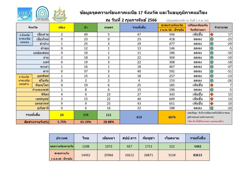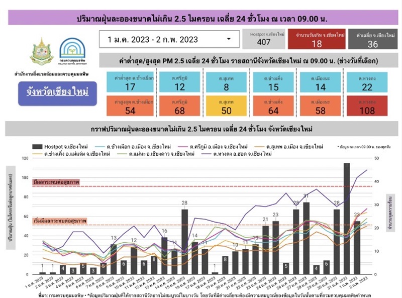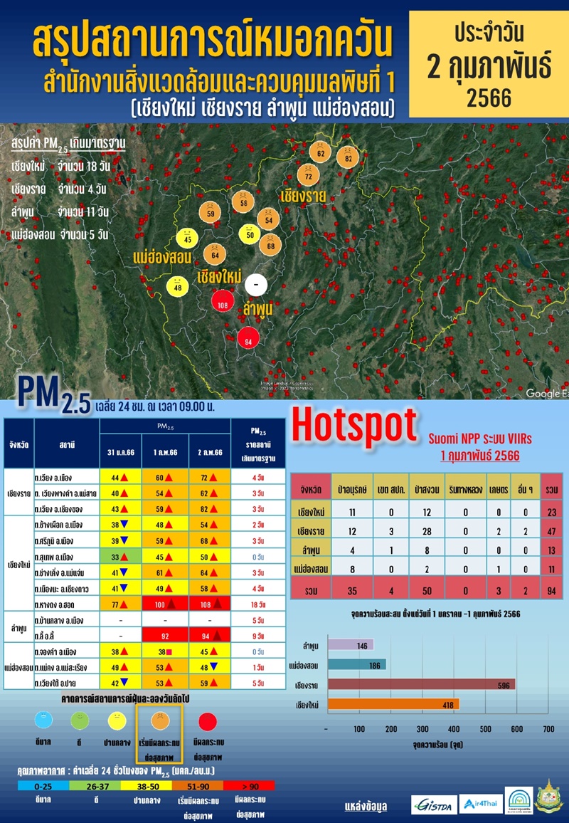 สรุปสถานการณ์ฝุ่น PM2.5 ประจำวันที่ 2 กุมภาพันธ์ 2566 ในพื้นที่รับผิดชอบของสำนักงานสิ่งแวดล้อมและควบคุมมลพิษที่ 1 (เชียงใหม่ เชียงราย ลำพูน แม่ฮ่องสอน)