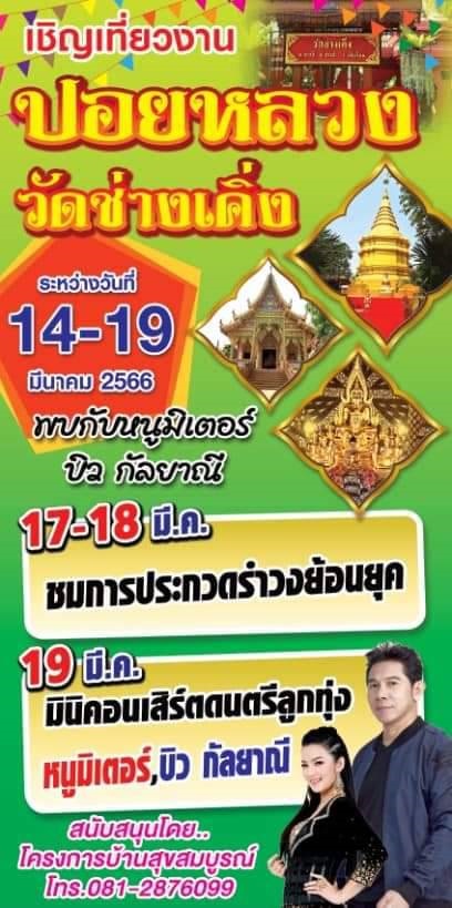โดยงานปอยหลวงจะมีตั้งแต่วันที่ 14-19 มี.ค.66 วันที่ 17-18 จะมีการแสดงรำวงย้อนยุค การละเล่นสินค้าต่างๆ ส่วนในวันที่ 19 มี.ค.66 ชมมินิคอนเสิร์ตหนูมิเตอร์และบิว กัลยาณี เชิญชวนประชาชนนักท่องเที่ยวร่วมงานในครั้งนี้