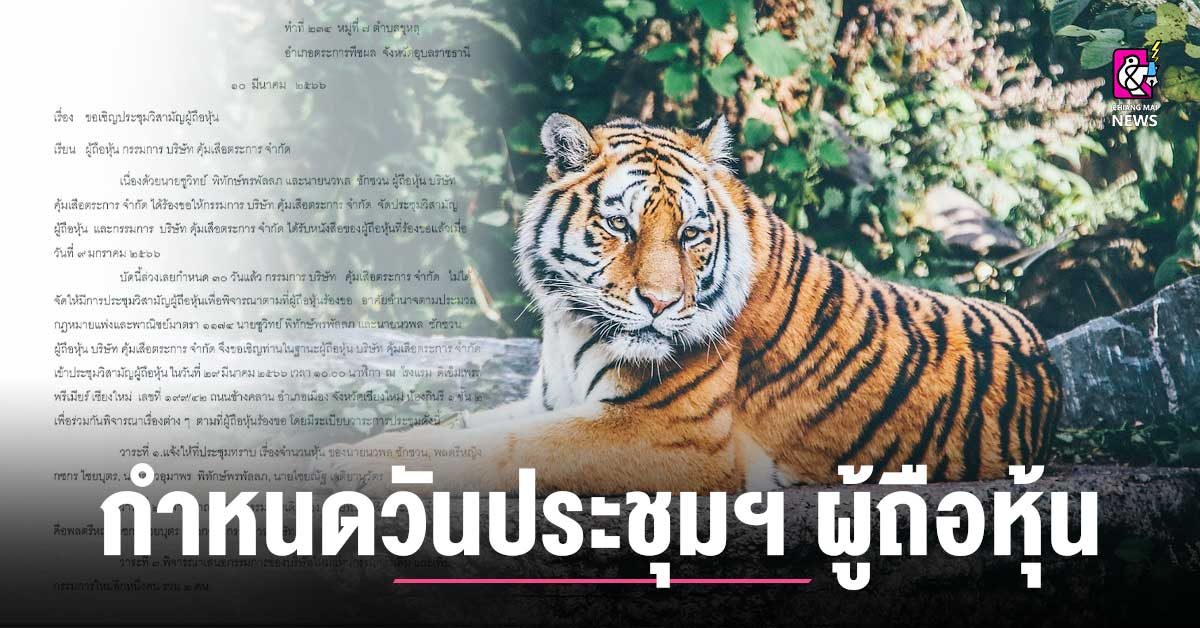 ผู้ถือหุ้นบริษัทคุ้มเสือตระการ จำกัด แจ้งกำหนดวันประชุมวิสามัญผู้ถือหุ้นบริษัทฯ ในวันที่ 29 มีนาคม 2566 เวลา 10.00 น. ณ โรงแรมดิเอ็มเพรส พรีเมียร์ อ.เมือง จ.เชียงใหม่