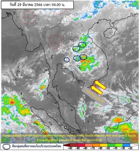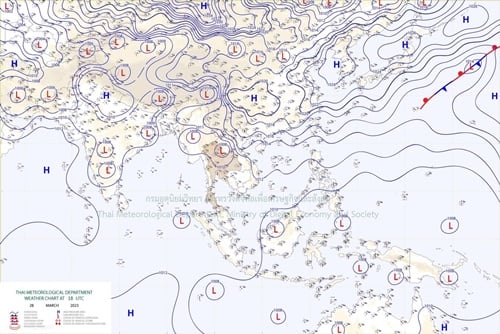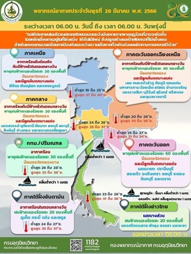 ลักษณะอากาศทั่วไป พยากรณ์อากาศ 24 ชั่วโมงข้างหน้า ความกดอากาศต่ำเนื่องจากความร้อนยังคงปกคลุมประเทศไทยตอนบนทำให้บริเวณดังกล่าวมีอากาศร้อนโดยทั่วไปกับมีฟ้าหลัวในตอนกลางวันและมีอากาศร้อนจัดบางพื้นที่ในภาคเหนือและภาคกลาง ในขณะที่บริเวณความกดอากาศสูงหรือมวลอากาศเย็นกำลังปานกลางจากประเทศจีนแผ่ปกคลุมภาคตะวันออกเฉียงเหนือและทะเลจีนใต้ ส่งผลทำให้มีลมใต้และลมตะวันออกเฉียงใต้พัดนำความชื้นจากอ่าวไทยและทะเลจีนใต้เข้ามาปกคลุมประเทศไทยตอนบน ลักษณะเช่นนี้ทำให้บริเวณดังกล่าวมีพายุฤดูร้อนเกิดขึ้น โดยมีลักษณะของพายุฝนฟ้าคะนอง ลมกระโชกแรง และมีลูกเห็บตกบางแห่ง จึงขอให้ประชาชนระวังอันตรายจากพายุฤดูร้อนที่อาจจะเกิดขึ้น โดยหลีกเลี่ยงการอยู่ในที่โล่งแจ้ง ใต้ต้นไม้ใหญ่ สิ่งปลูกสร้างและป้ายโฆษณาที่ไม่แข็งแรง สำหรับเกษตรกรควรเตรียมการป้องกันและระวังความเสียหายที่จะเกิดต่อผลผลิตทางการเกษตรไว้ด้วย