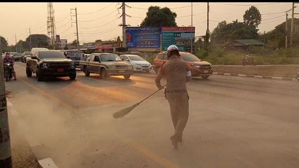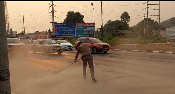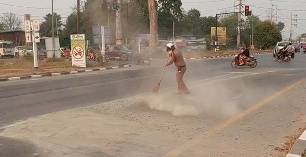 สารวัตรจราจร สภ.สารภี จ.เชียงใหม่ กวาดเศษหิน เศษปูน ตกหล่นอยู่บริเวณบนถนนพื้นผิวการจราจร เพื่อป้องกันการเกิดอุบัติเหตุ