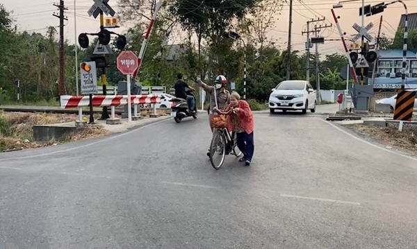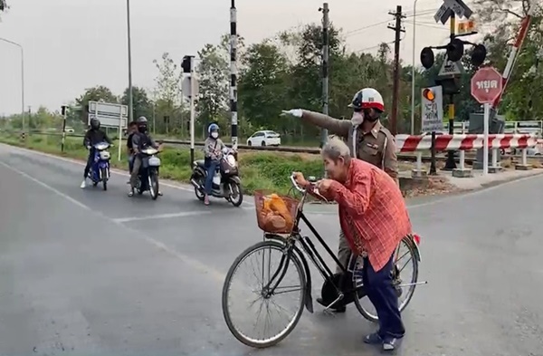 เจ้าหน้าที่ตำรวจ สภ.สารภี จ.เชียงใหม่ อำนวยความสะดวกให้ผู้สูงอายุซึ่งปั่นรถจักรยานจะข้ามถนน บริเวณทางตัดรถไฟ ได้ข้ามถนนโดยปลอดภัย