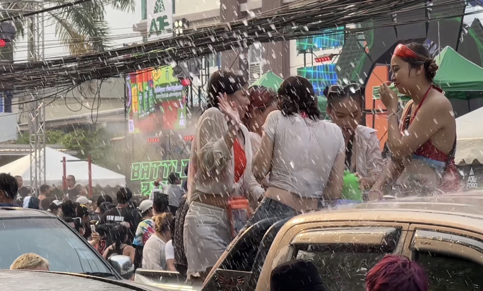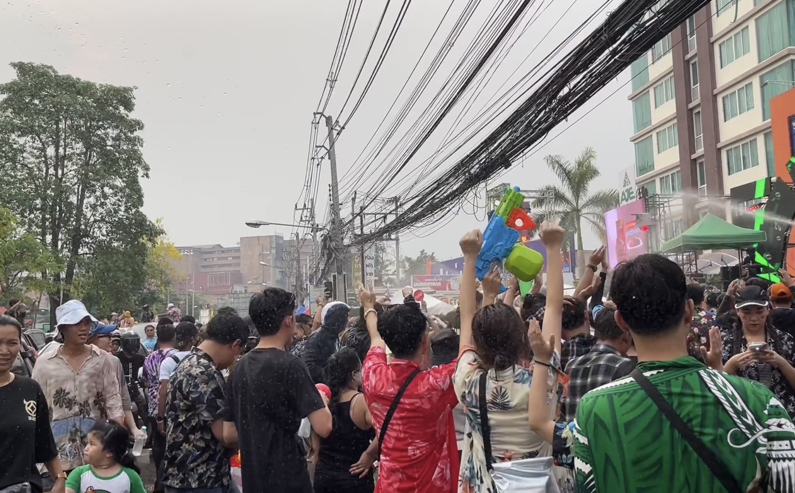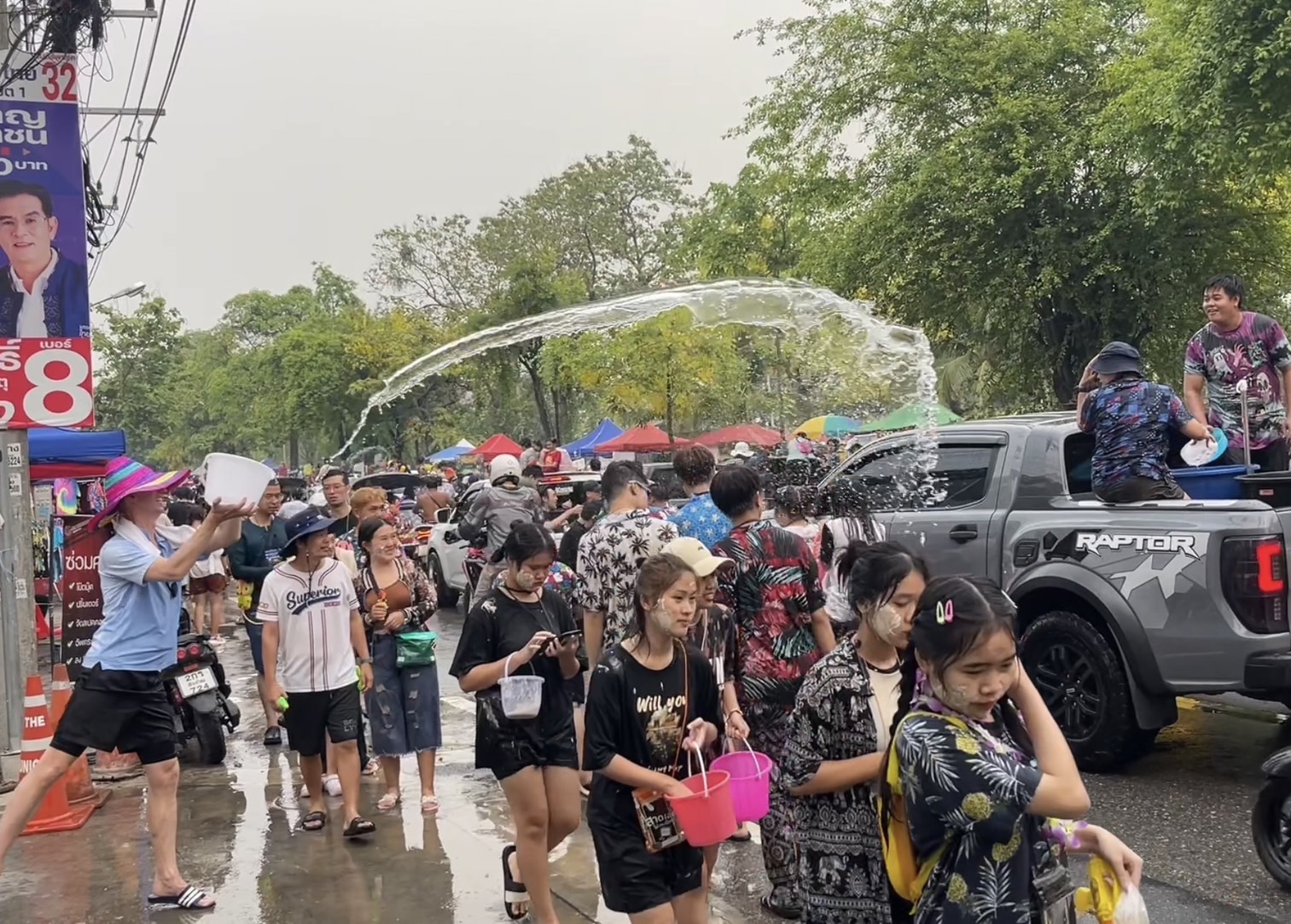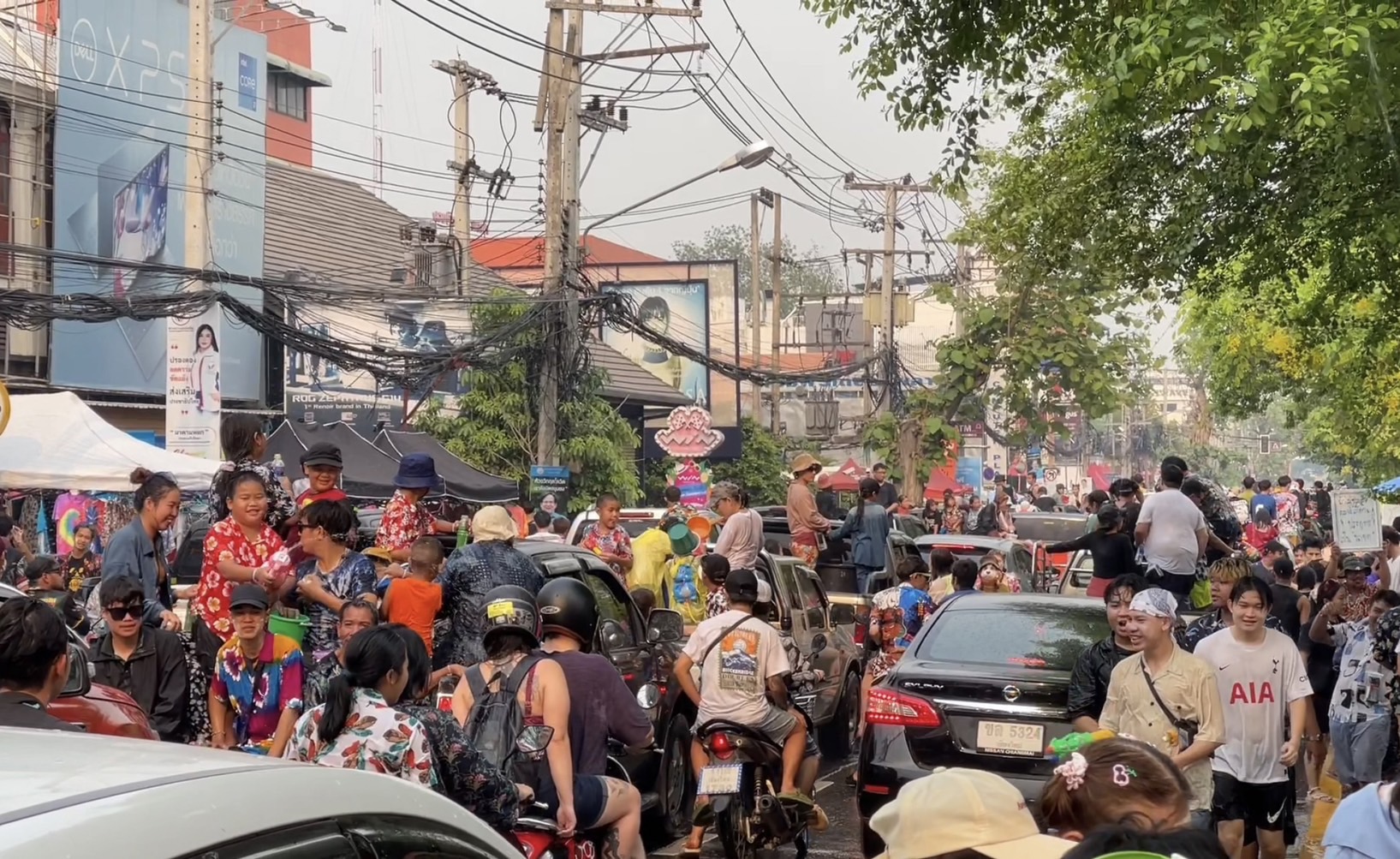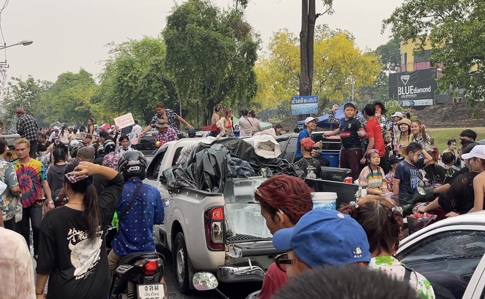 นอกจากนี้ ที่บริเวณถนนสายประตูช้างเผือก พบว่าถนนตลอดทั้งสายมีรถติดอย่างเนืองแน่นน จนเคลื่อนตัวได้ลำบาก เนื่องจากมีประชาชนและนักท่องเที่ยว พากันเดินเล่นสาดน้ำกันจนเต็มท้องถนน อีกทั้งมีการเปิดเพลงเต้นกันอย่างสนุกสนานตลอดทั้งสาย โดยทุกคนต่างมีรอยยิ้มที่มีความสุข แม้ตัวเองจะเปียกปอน จนบางคนหนาวสั่นเนื่องจากถนนสายนี้ส่วนใหญ่จะเล่นน้ำเย็นแช่น้ำแข็ง เพื่อคลายร้อยและสดชื่นเวลาสาดใส่กัน อย่างไรก็ตาม ถนนสายนี้ยังคงมีความคึกคักอย่างต่อเนื่อง โดยคาดว่าในนี้ ประชาชนและนักท่องเที่ยวจะร่วมเล่นสาดน้ำกันอย่างต่อเนื่องกันจนถึงช่วงค่ำๆ