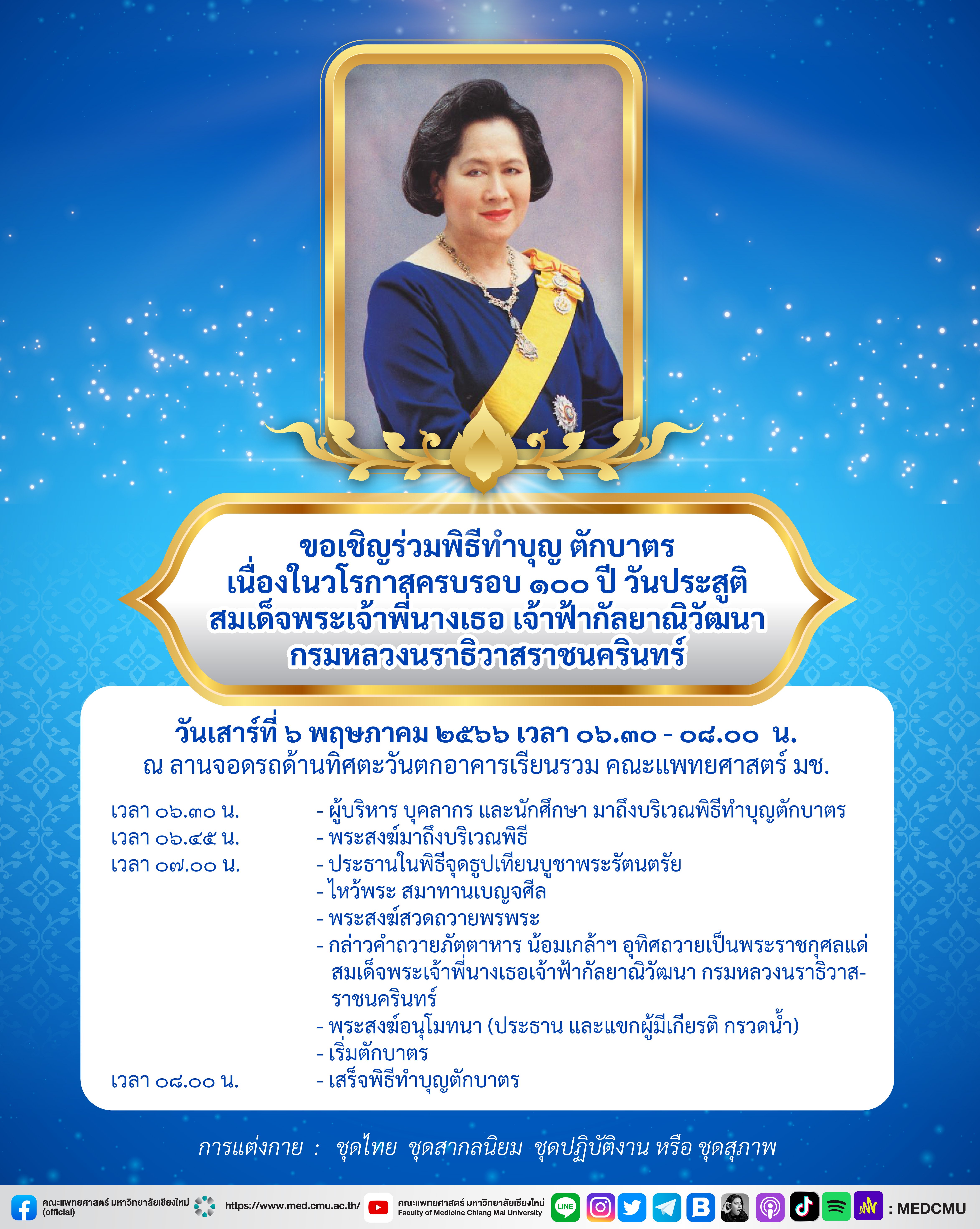 ขอเชิญร่วมพิธีทำบุญ ตักบาตร เนื่องในวโรกาสครบรอบ 100 ปี วันประสูติ สมเด็จพระเจ้าพี่นางเธอ เจ้าฟ้ากัลยาณิวัฒนากรมหลวงนราธิวาสราชนครินทร์