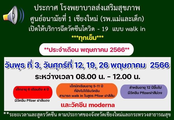 ประกาศ การให้บริการ ฉีดวัคซีนโควิด-19 โรงพยาบาลส่งเสริมสุขภาพศูนย์อนามัยที่ 1 เชียงใหม่ ประจำเดือนพฤษภาคม 2566