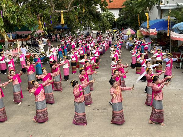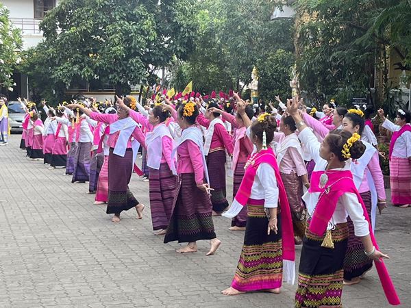เมื่อขบวนมาถึงลานต้นศรีมหาโพธิ์ มีช่างฟ้อน จำนวนกว่า 50 ชีวิต ฟ้อนต้อนรับขบวนแห่น้ำนม