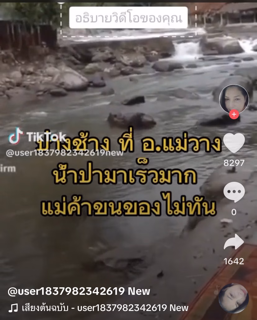 จากกรณีได้มีสมาชิกเพจTikTok ได้ส่งคลิป พร้อมคำบรรยายว่าเกิดน้ำป่าไหลหลากที่ปางช้างแม่วาง อ.แม่วาง น้ำป่ามาแรงมาก แม่ค้าขนของไม่ทัน เป็นภาพที่น่ากลัวมากนั้น