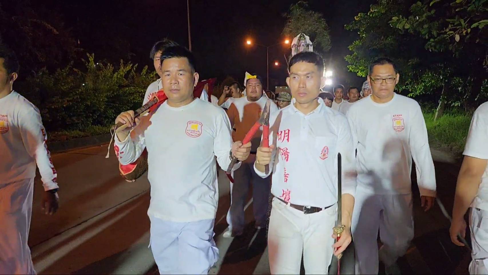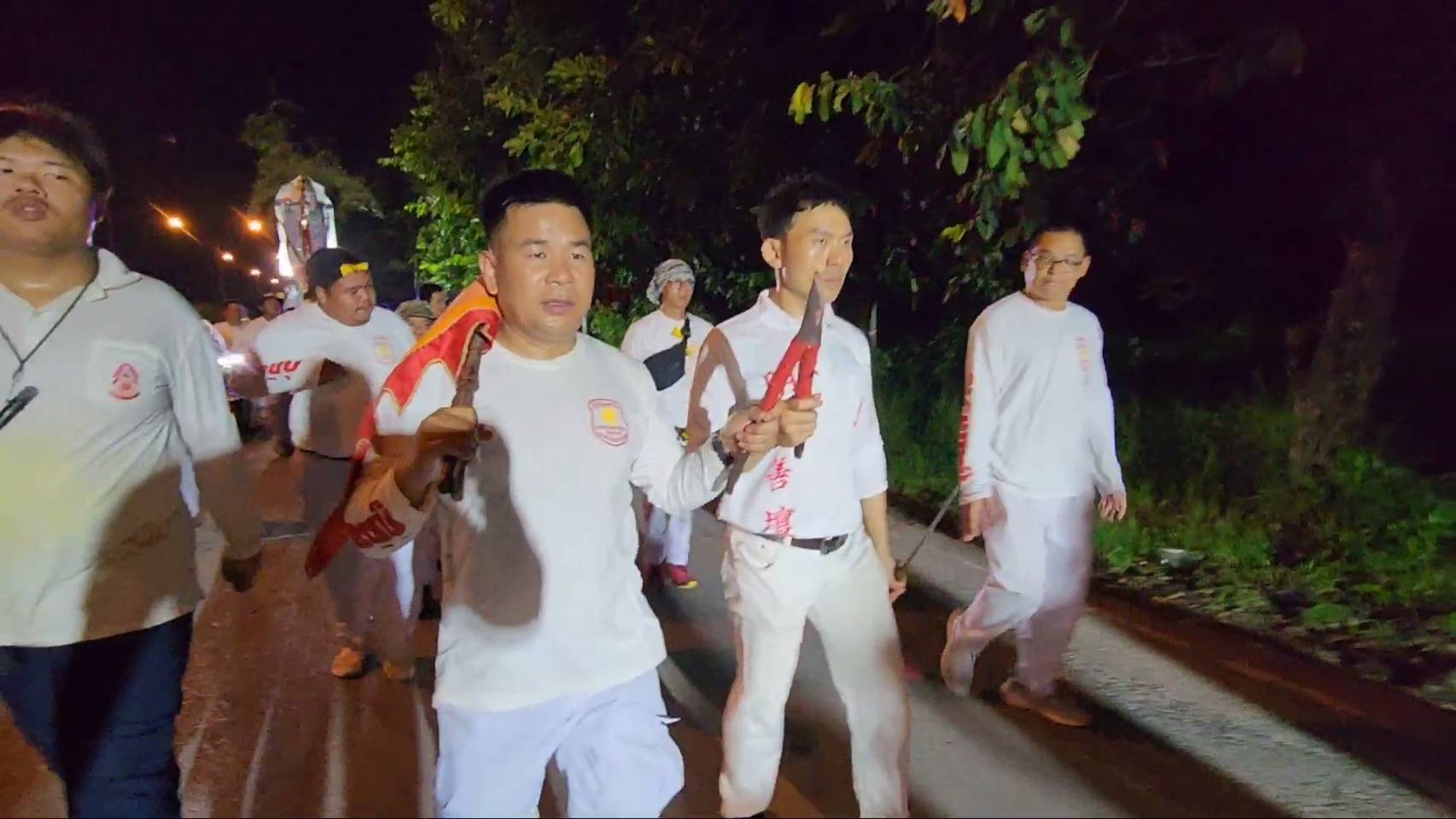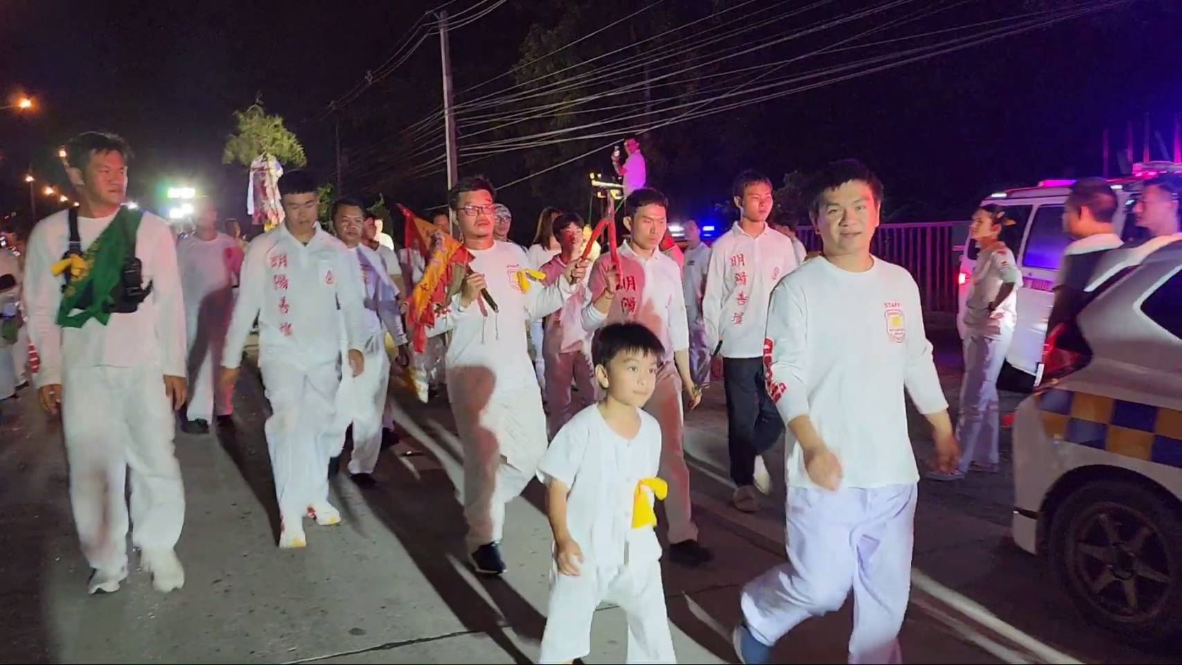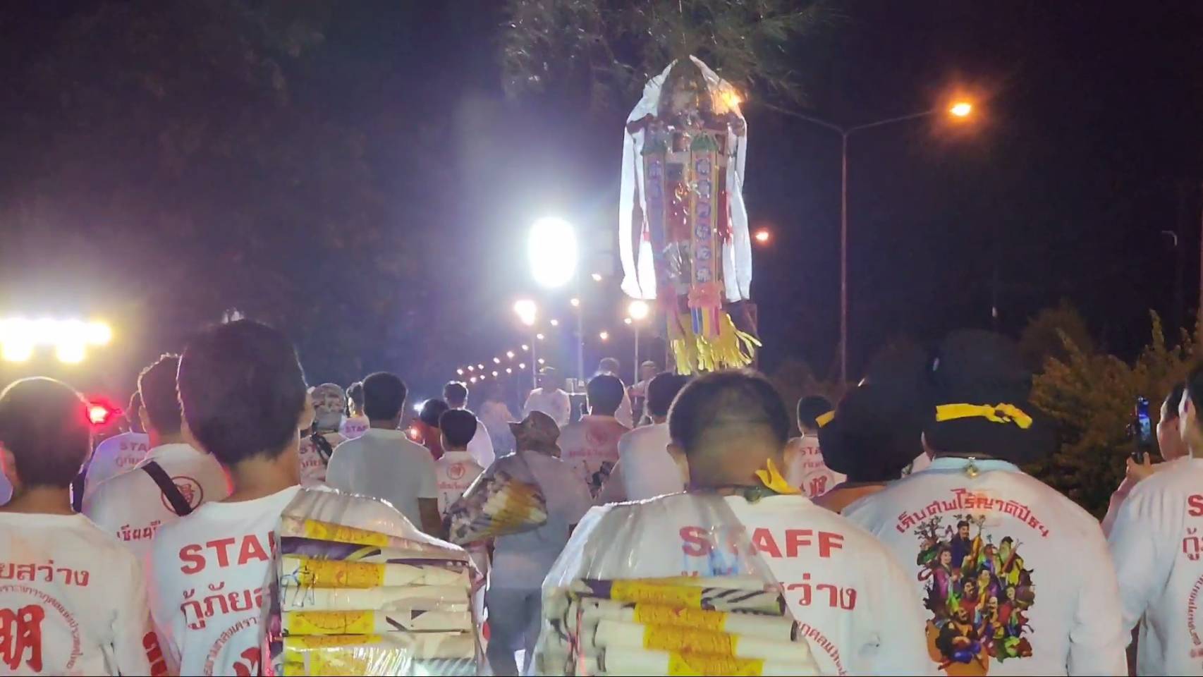 สำหรับพิธีดังกล่าวมีร่างทรงเจ้าจัดเป็นขบวน ในร่างทรงมีการถือไม้กี 2 คน เดินไปตามถนนทั้งในเขตชุมชน และตามเส้นทางต่างๆ เพื่อเชิญดวงวิญญาณเร่ร่อน ซึ่งปรากฏว่าเกือบตลอดเส้นทาง ทั้งทางแยก ทางโค้ง ซึ่งเคยเกิดอุบัติเหตุรถชน เหตุฆาตกรรมต่าง ๆ
