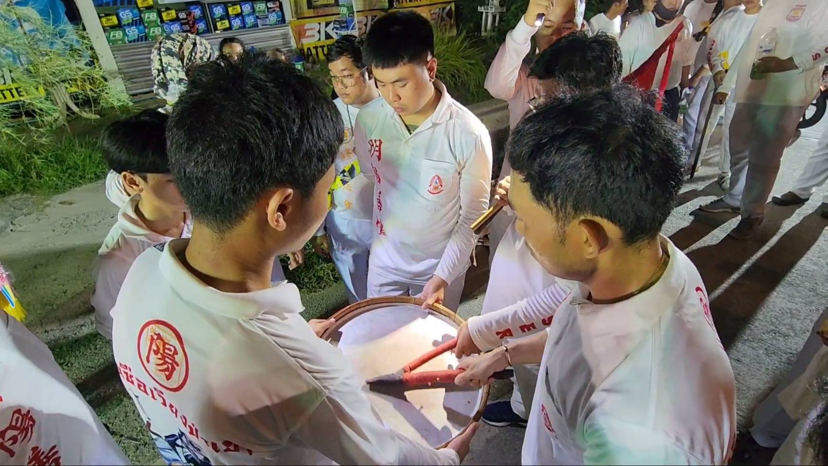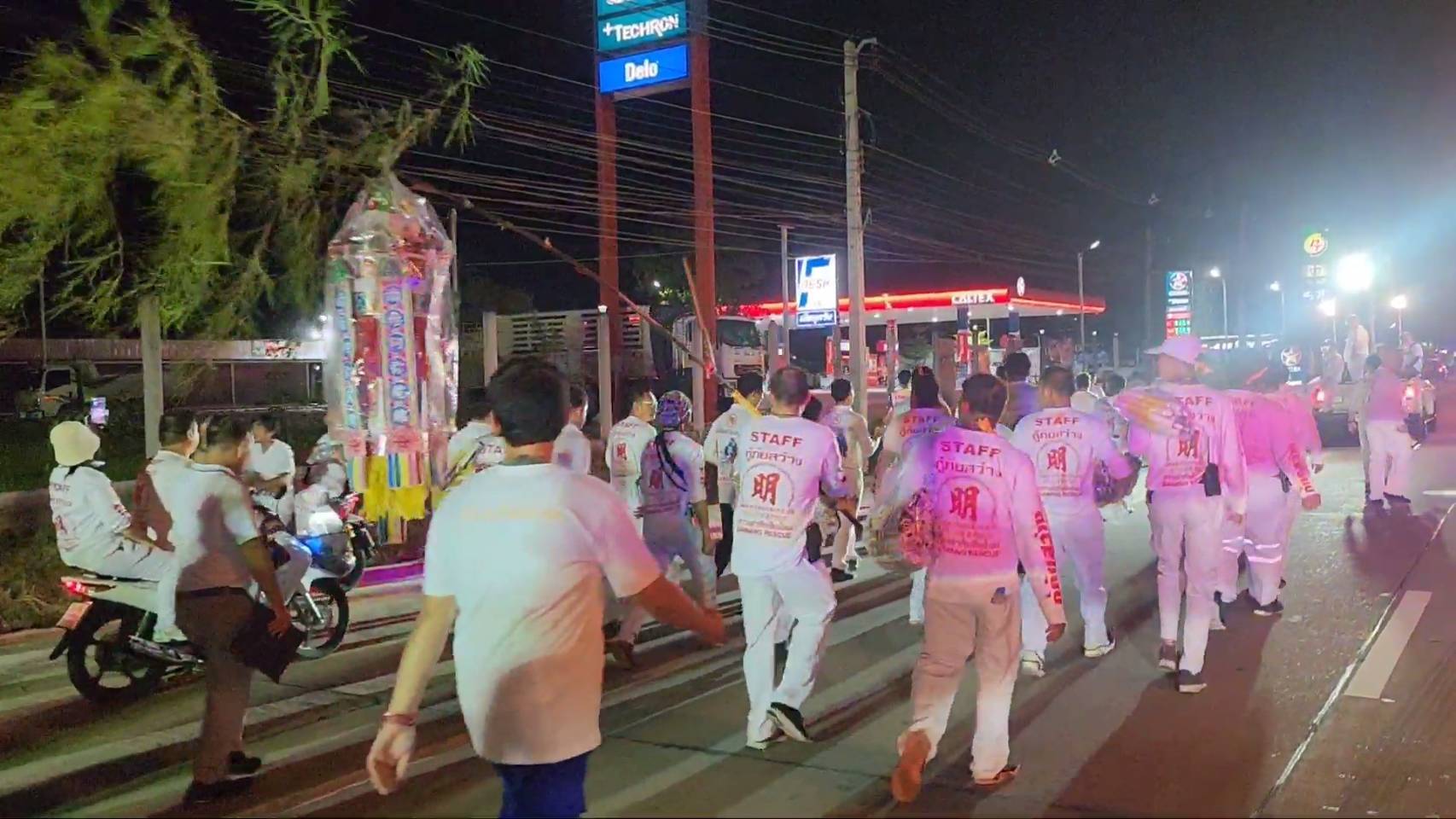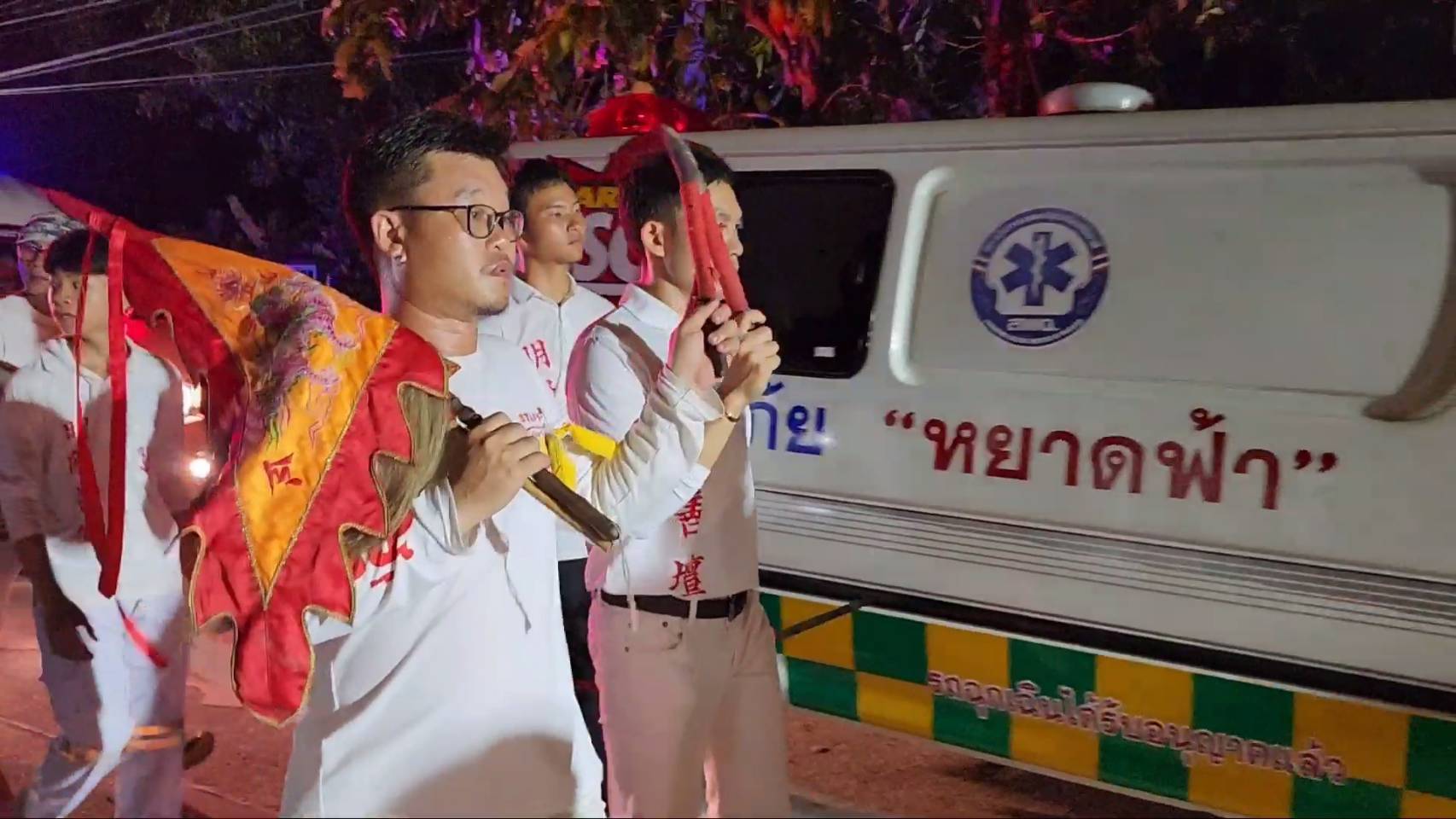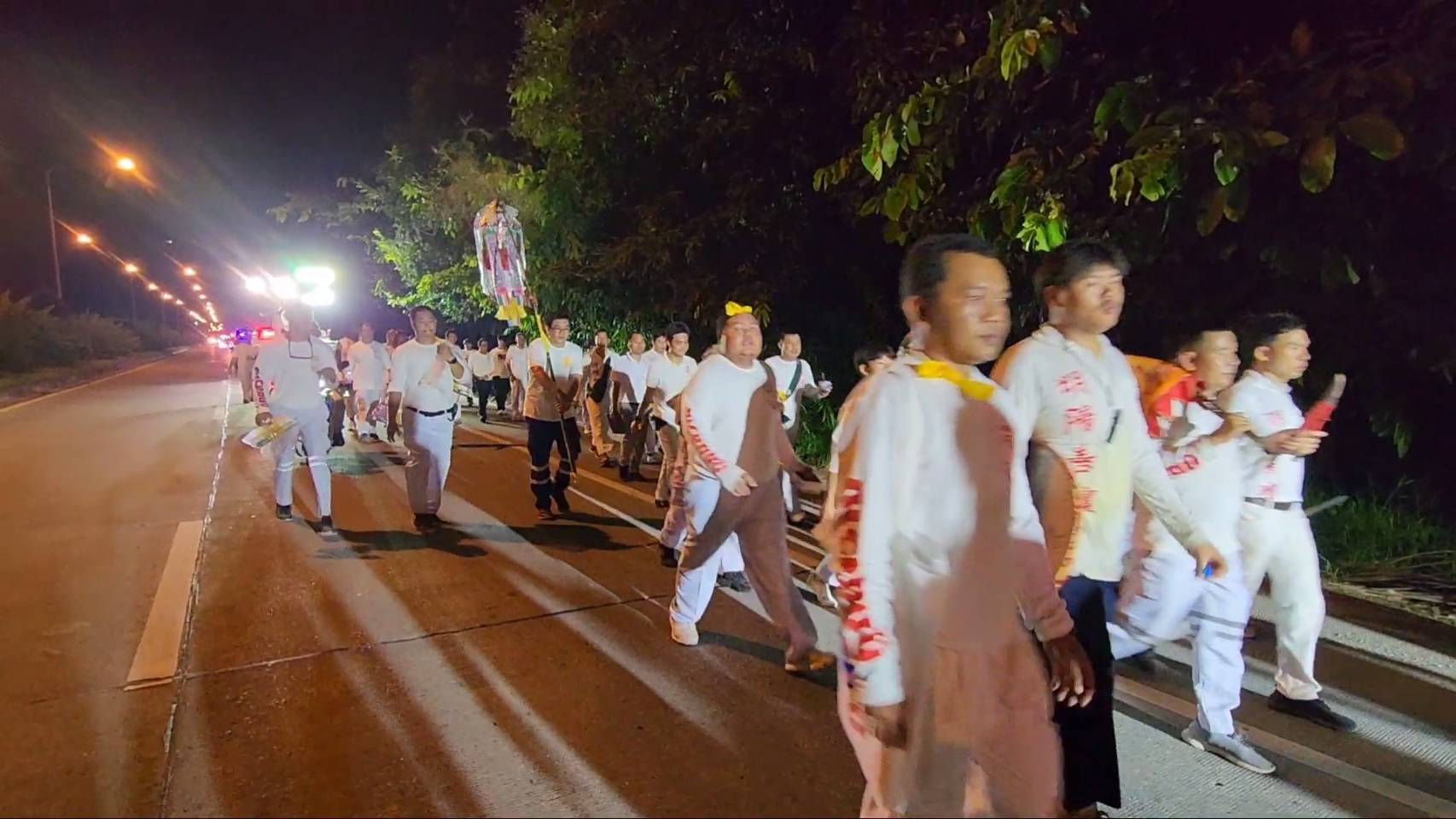 สำหรับพิธีดังกล่าวมีร่างทรงเจ้าจัดเป็นขบวน ในร่างทรงมีการถือไม้กี 2 คน เดินไปตามถนนทั้งในเขตชุมชน และตามเส้นทางต่างๆ เพื่อเชิญดวงวิญญาณเร่ร่อน ซึ่งปรากฏว่าเกือบตลอดเส้นทาง ทั้งทางแยก ทางโค้ง ซึ่งเคยเกิดอุบัติเหตุรถชน เหตุฆาตกรรมต่าง ๆ