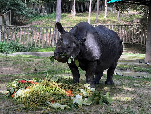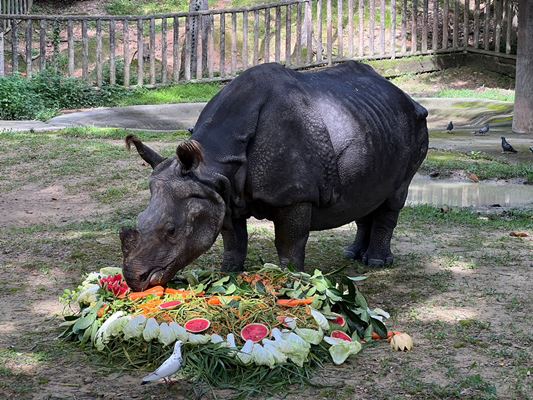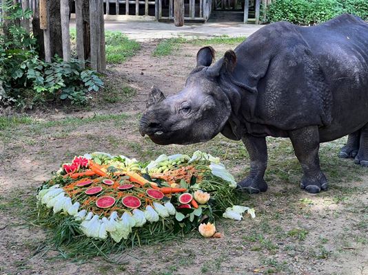 ซึ่งในปีนี้ทางทีมพี่เลี้ยงได้มีการอาบน้ำทำความสะอาดให้กับ แรดอินเดีย โดยใช้แปรงขนอ่อนขัดถูทั่วตัว และมีการจัดโตกอาหารขนาดใหญ่ พร้อมอาหารโปรดมอบให้กับ “กาลิ” ด้วย ประกอบด้วย ยอดอ่อนของใบไทร ใบขนุนอ่อน หญ้าสด ถั่วฝักยาว ผักบุ้ง กล้วย ฟักทอง และแครอท เป็นต้น ทั้งนี้เพื่อเป็นการส่งเสริมพฤติกรรมที่เป็นธรรมชาติ ให้แรดกาลิใช้จมูกในการดมกลิ่น มีการเคลื่อนไหว และยังถือเป็นการออกกำลังกายให้กับแรดด้วย และบริเวณด้านหน้าส่วนจัดแสดงแรดอินเดีย มีการจัดนิทรรศการให้ความรู้เกี่ยวกับแรดอินเดีย พร้อมกิจกรรม DIY ประดิษฐ์รูปสัตว์จากใบไม้ วาดภาพระบายสี กิจกรรม Live ผ่าน Facebook เล่นเกมทายปัญหาชิงของรางวัล อีกด้วย