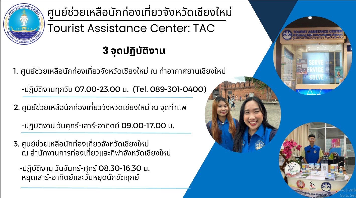ตั้งแต่เวลา 07.00-23.00 น. และในอนาคตจะขยาย ตามการขยายเวลาเที่ยวบินที่เพิ่มขึ้น 24 ชั่วโมง ส่วนอีกจุด คือ ศูนย์ช่วยเหลือนักท่องเที่ยวที่ประตูท่าแพ เปิดให้บริการในวันศุกร์ เสาร์ อาทิตย์ ตั้งแต่เวลา 09.00-17.00 น. และศูนย์ช่วยเหลือนักท่องเที่ยว ณ สำนักงานการท่องเที่ยวและกีฬาจังหวัดเชียงใหม่ เปิดให้บริการในวันและเวลาราชการ นอกจากนี้นักท่องเที่ยวยังสามารถโทรสายด่วนเพื่อขอความช่วยเหลือในสถานการณ์ฉุกเฉินได้ 3 ช่องทาง คือ สายด่วน 191 แจ้งเหตุด่วนเหตุร้ายกับตำรวจ สายด่วน 1669 ขอความช่วยเหลือด้านการแพทย์ฉุกเฉิน และสายด่วน 1155 ตำรวจท่องเที่ยว
