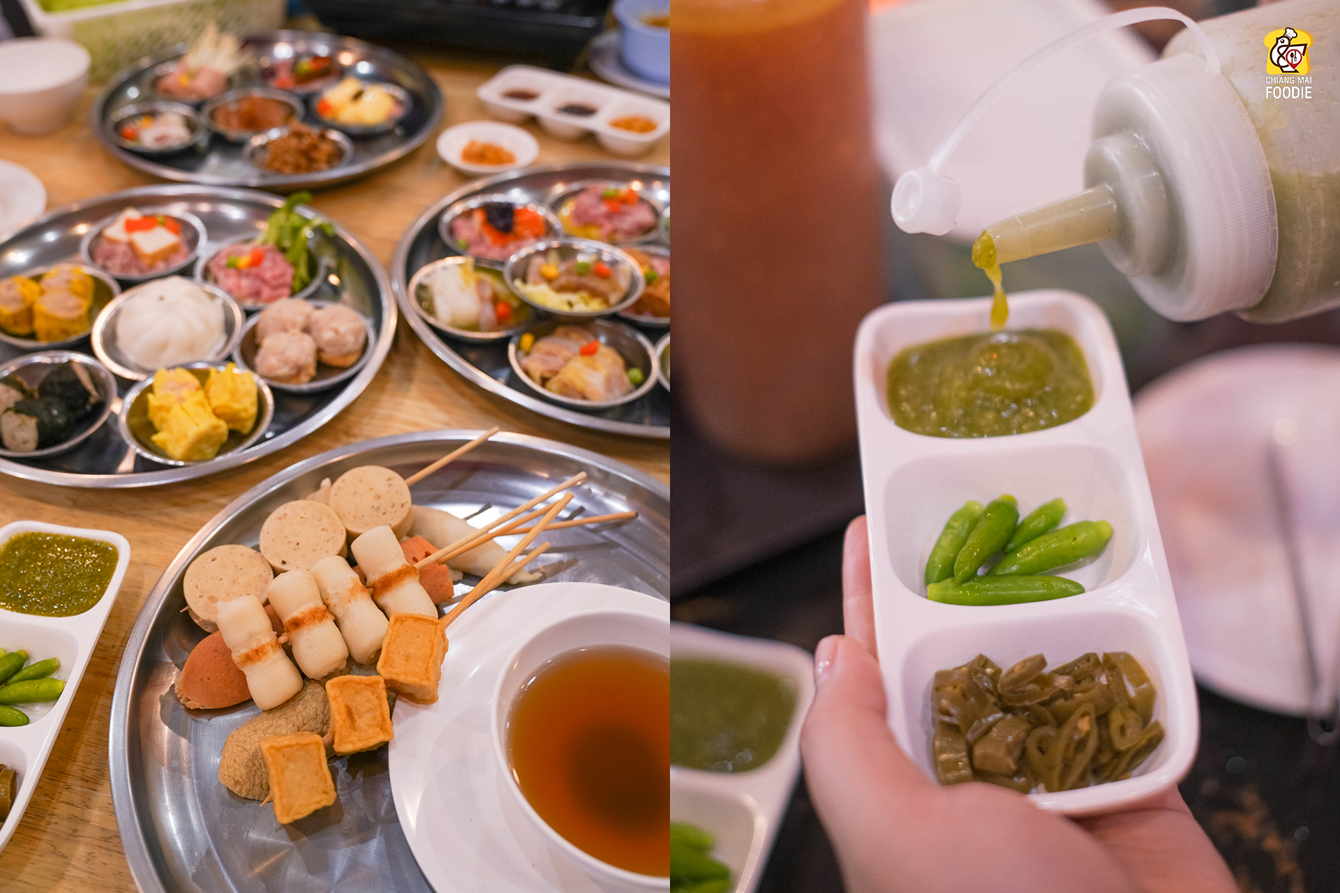 น้ำจิ้มเครื่องเคียงก็มีให้หลายแบบ มีที่จับกันร้อนให้ด้วย ในหม้อสำหรับนึ่ง มีให้นึ่งทีละ 2 ชั้น