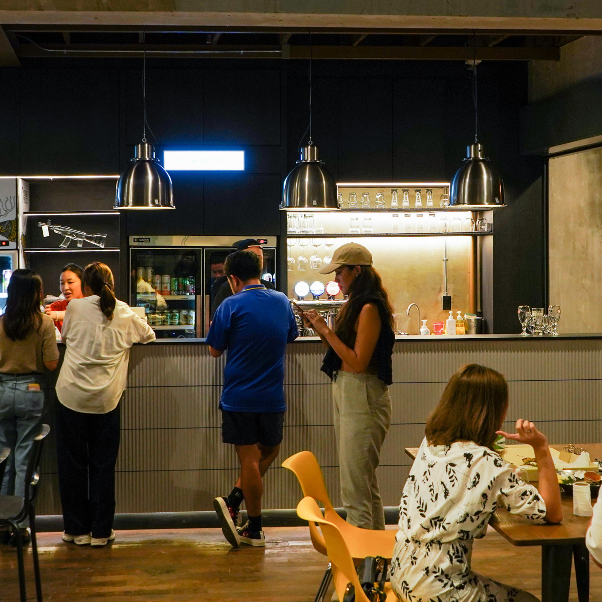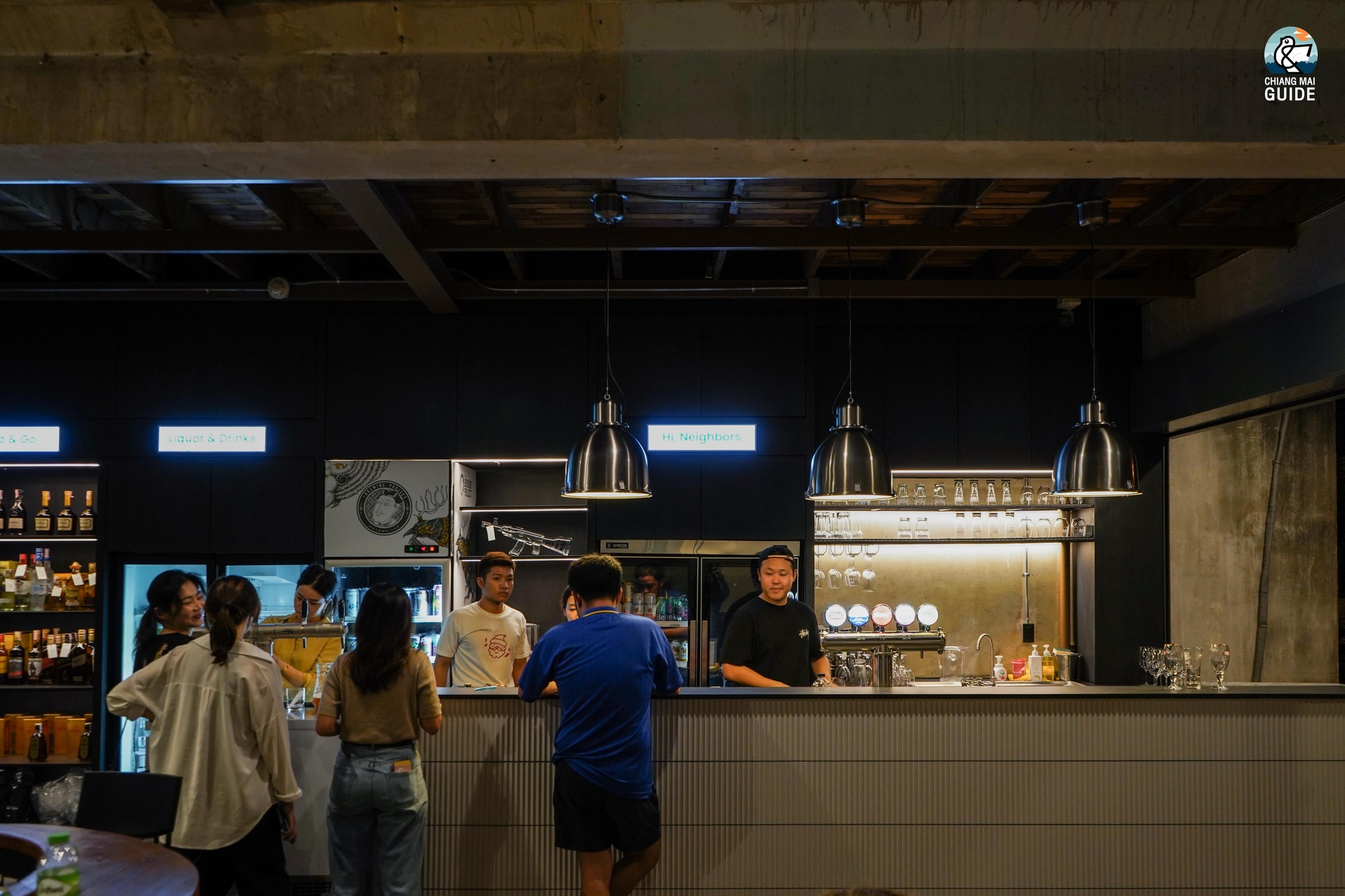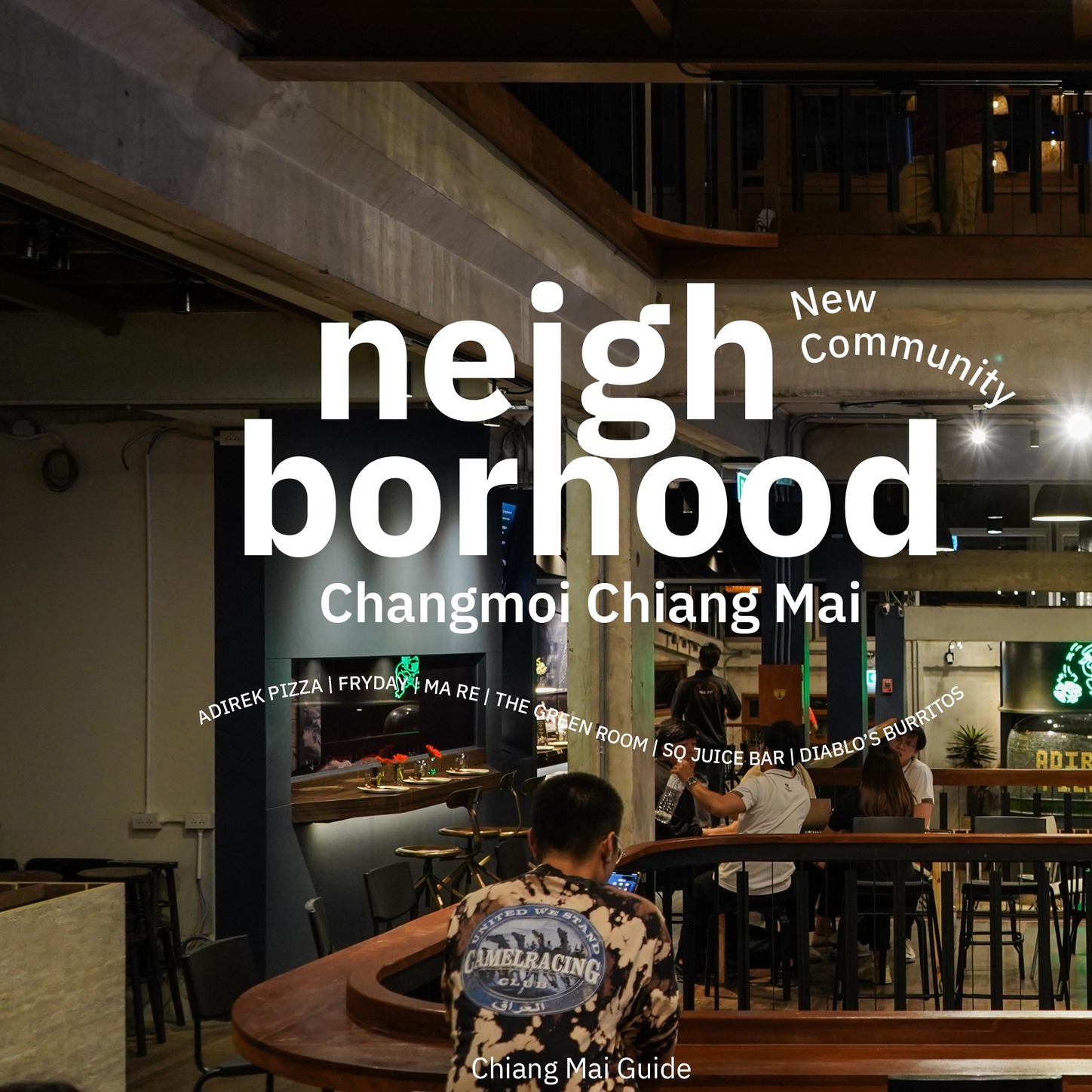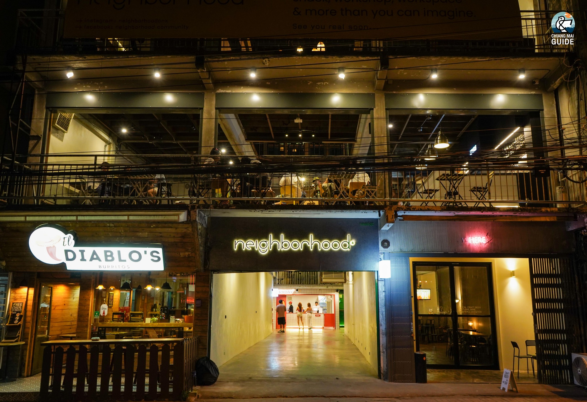 Neighborhood คอมมูนิตี้แห่งใหม่ย่านช้างม่อย ที่รีโนเวทมาจากตึกแถวเก่า และได้ออกแบบต่อเติมใหม่ภายใต้โครงสร้างเดิม ออกมาเป็นตึกที่มีสถาปัตยกรรมภายในสวยงามมาก เหมาะสำหรับการมานั่งแฮงก์เอ้าท์สุดๆ