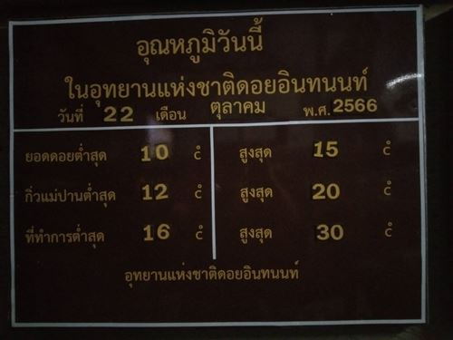 วันนี้นักท่องเที่ยวเดินทางขึ้นไปเที่ยวอุทยานแห่งชาติดอยอินทนนท์กันจำนวนมาก โดยเฉพาะจุดชมวิว ลานจอด ฮ. จุดชมวิวกิ่วแม่ปาน ส่วนอุณหภูมิต่ำสุด เช้าวันนี้ วัดได้ 10 องศาฯ ถือว่าอากาศหนาวเย็นมาก ได้สร้างความประทับใจให้นักท่องเที่ยวที่เดินทางมาสัมผัสอากาศหนาวเย็นในช่วงวันหยุดยาวนี้