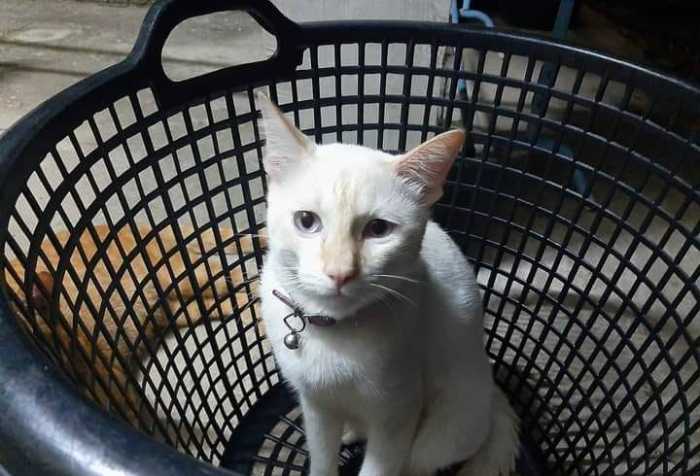 ชื่อ “น้องมีตัง” สีขาว เพศผู้ สวมปลอกคอสีม่วง อายุ 11 เดือน