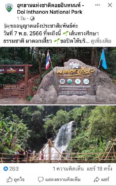 ทางอุทยานแห่งชาติดอยอินทนนท์ จ.เชียงใหม่ แจ้งว่าในวันที่ 7 พ.ย. 2566 ที่จะถึงนี้