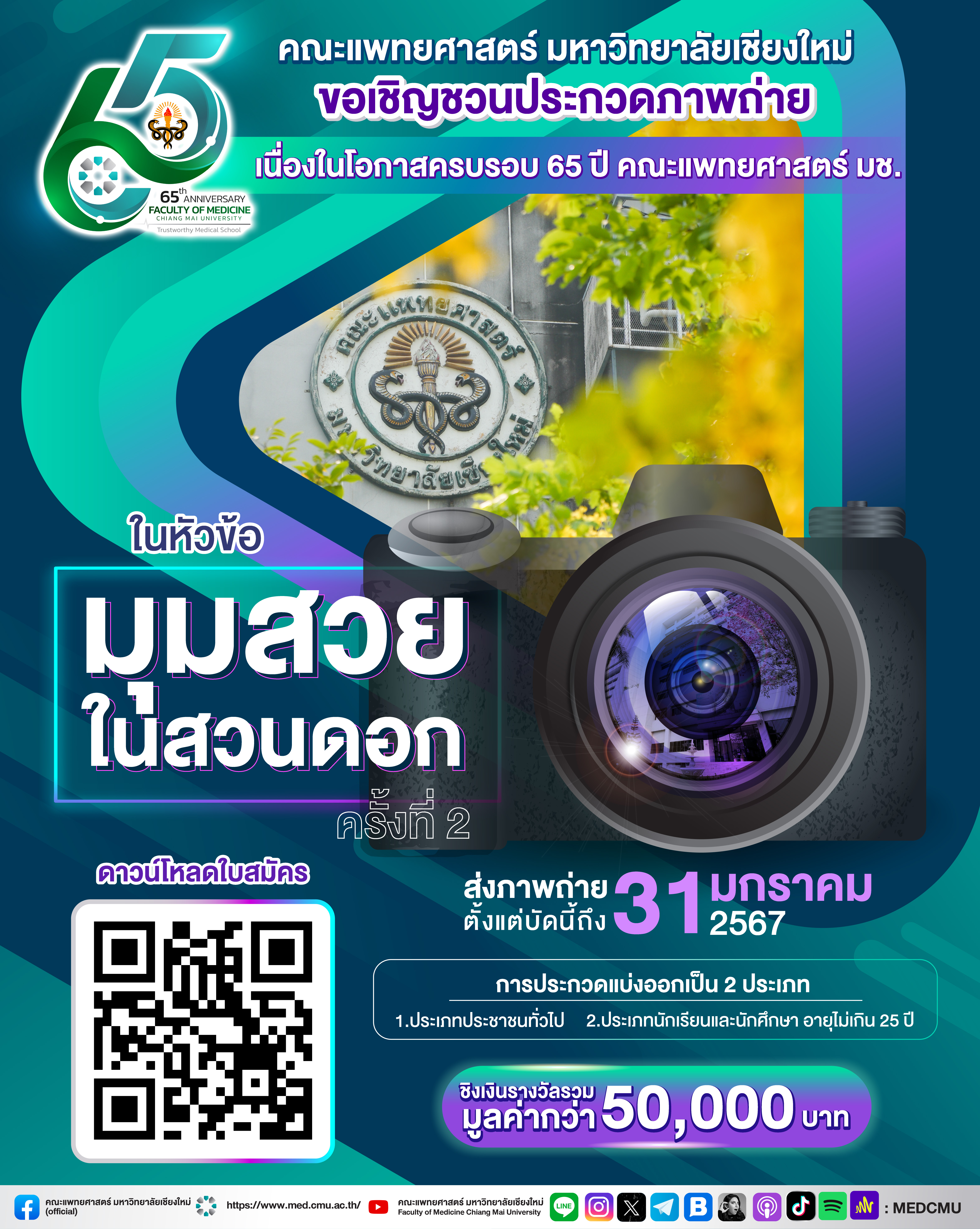คณะแพทยศาสตร์ มหาวิทยาลัยเชียงใหม่ ขอเชิญชวนประกวดภาพถ่าย เนื่องในโอกาสครบรอบ 65 ปี คณะแพทยศาสตร์ มช. 📸 ในหัวข้อ “มุมสวยในสวนดอก ครั้งที่ 2”