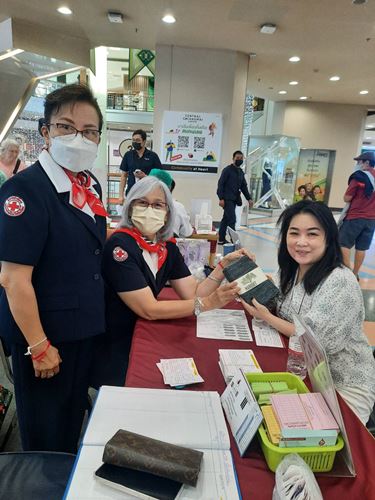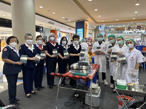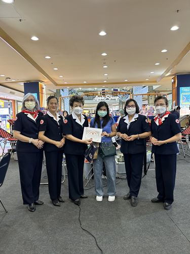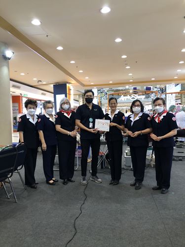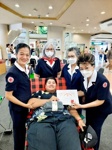 ในโอกาสนี้ ทางคณะกรรมการ สมาชิกเหล่ากาชาดฯ และภาคบริการโลหิตแห่งชาติที่ 10 ได้มอบเข็มกาชาดสมนาคุณ พร้อมใบประกาศนียบัตร ให้แก่ผู้บริจาคครั้งที่ 7 จำนวน 4 ราย และครั้งที่ 24 จำนวน 1 ราย (ในภาพมอบให้) คุณธาดา เรียบทวี อายุ 30 ปี ชาวบ้านหมู่ที่ 7 ต.หางดง อ.หางดง จ.เชียงใหม่ (อาชีพรับจ้าง) ที่บริจาคครั้งที่ 7 คุณนันทิกานต์ เบียงแลภู่ อายุ 42 ปี ชาวบ้านย่านถนนเวียงพิงค์ ต.ช้างคลาน อ.เมือง จ.เชียงใหม่ (อาชีพรับจ้าง) ที่บริจาคครั้งที่ 7 และว่าที่ ร.ต.หญิงชนากานต์ อุ่ยพานิช อายุ 27 ปี ชาวบ้านหมู่ที่ 1 ต.ยางเนิ้ง อ.สารภี จ.เชียงใหม่ (อาชีพรับจ้าง) ที่บริจาคครั้งที่ 24 ณ เซ็นทรัล เชียงใหม่ แอร์พอร์ต ก็ขออนุโมทนาบุญในครั้งนี้ด้วย