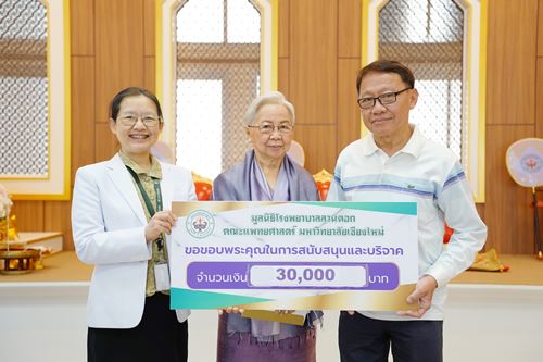 รศ.พญ.ประภาพร สู่ประเสริฐ รองคณบดีคณะแพทยศาสตร์ มช. รับมอบเงินบริจาค จำนวน 30,000 บาท จากคุณพิไลวรรณ โจลานันท์ โดยบริจาคสมทบทุนมูลนิธิโรงพยาบาลสวนดอก เพื่อพระภิกษุสงฆ์อาพาธ จำนวน 20,000 บาท และสมทบทุนมูลนิธิโรงพยาบาลสวนดอก คณะแพทยศาสตร์ มช. จำนวน 10,000 บาท เมื่อวันที่ 23 มกราคม 2567 ณ ห้องพิธีการสงฆ์ ชั้น 1 โรงพยาบาลสงฆ์แห่งโรงพยาบาลมหาราชนครเชียงใหม่ คณะแพทยศาสตร์ มช.