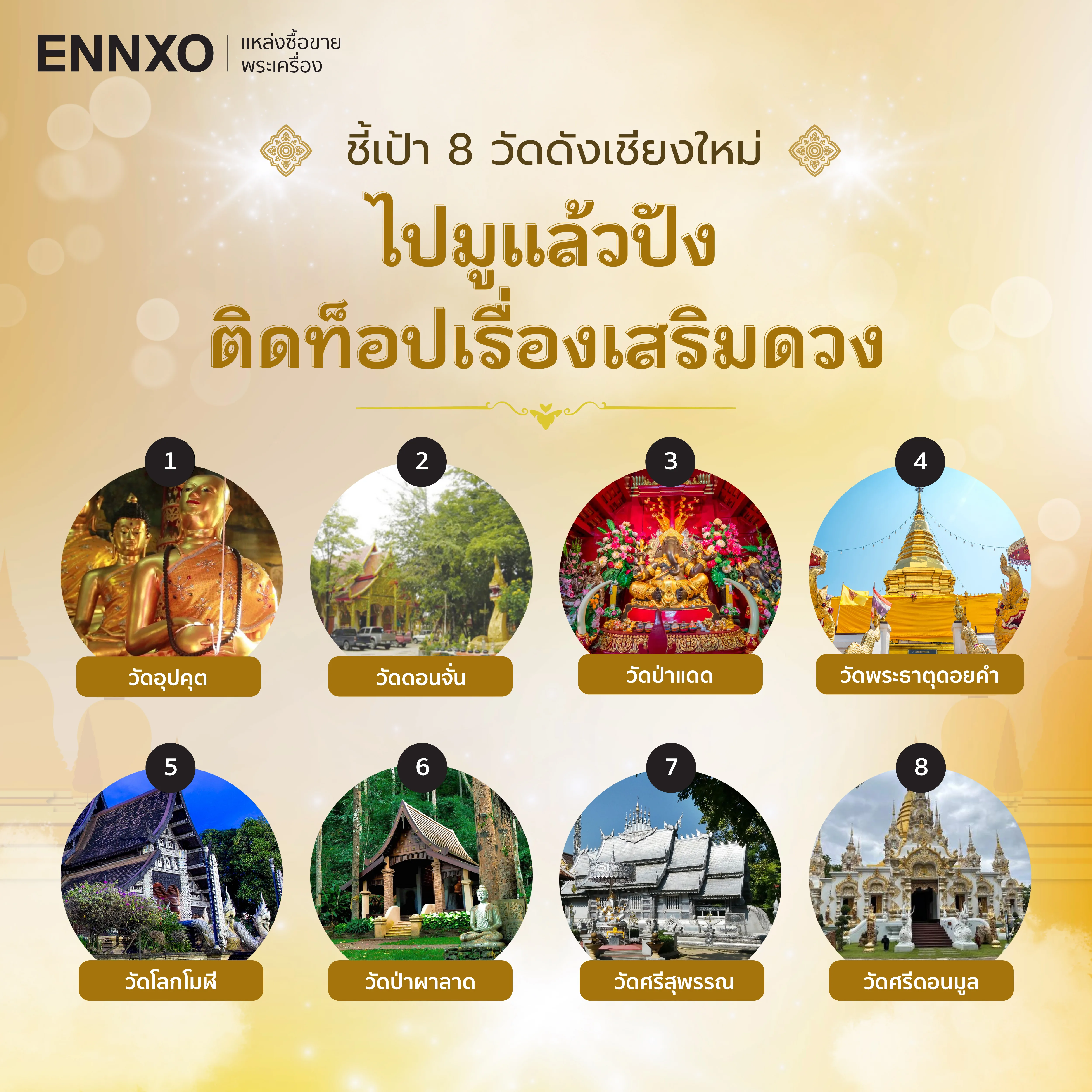 โดย ENNXO ขอพาทุกคนเดินทางไปสำรวจ 8 วัดดังมูปังๆ บรรยากาศอบอุ่น ที่ไปแล้วได้ทั้งแต้มบุญ และได้ชมวิวทิวทัศน์สุดโรแมนติกไปพร้อมกัน วัดไหนจะยืนหนึ่งเป็นท็อปในเรื่องเสริมดวง แล้วสามารถมูด้านไหนได้บ้าง ไปดูพร้อมกันได้เลย