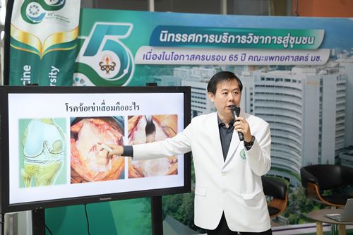 ศ.(เชี่ยวชาญพิเศษ)นพ.บรรณกิจ โลจนาภิวัฒน์ คณบดีคณะแพทยศาสตร์ มช. เป็นประธานในพิธีเปิดนิทรรศการเนื่องในโอกาสครบรอบ 65 ปี คณะแพทยศาสตร์ มช. เรื่อง “ข้อเข่าเสื่อม” โดยมี ผศ.ดร.นพ.สักกาเดช ลิ้มมหาคุณ หัวหน้าภาควิชาออร์โทปิดิกส์ คณะแพทยศาสตร์ มช. กล่าวรายงานวัตถุประสงค์ของการจัดงาน โดยภายในงานได้จัดให้มีเสวนาให้ความรู้เกี่ยวกับข้อเข่าเสื่อม โดยทีมวิทยากรจากภาควิชา และมีการแสดงการออกกำลังกายบริหารข้อเข่าโดยนักกายภาพบำบัด ภาควิชาออร์โทปิดิกส์ ให้แก่ผู้ที่สนใจ ในวันที่ 19 กุมภาพันธ์ 2567 ณ บริเวณโถง ชั้น 1 อาคารเฉลิมพระบารมี คณะแพทยศาสตร์ มช.