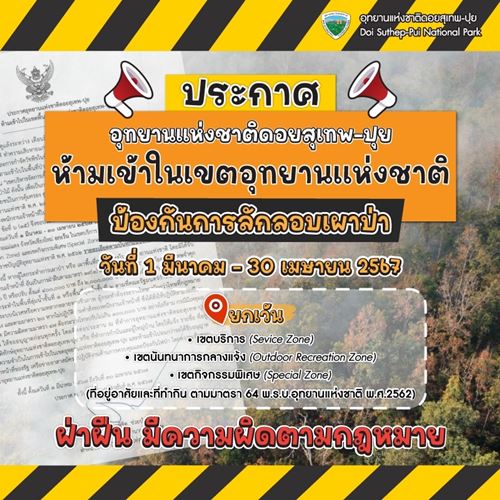 วันที่ 27 ก.พ.67 นายภูพิชิต ช่วยบำรุง นักวิชาการป่าไม้ชำนาญการพิเศษ ทำหน้าที่หัวหน้าอุทยานแห่งชาติดอยสุเทพ-ปุย ออกประกาศห้ามเข้าในเขตพื้นที่อุทยานแห่งชาติดอยสุเทพ-ปุย เพื่อเป็นการป้องกันการลักลอบเผาป่า ตั้งแต่วันที่ 1 มีนาคม – 30 เมษายน 2567 เนื่องด้วยในช่วงฤดูแล้งระหว่าง เดือนมีนาคม ถึงเดือนเมษายน ของทุกปี มักจะเกิดไฟป่าขึ้นเป็นประจำในพื้นที่อุทยานแห่งชาติ ทำความเสียหายแก่ทรัพยากรป่าไม้และสัตว์ป่าอย่างรุนแรง สาเหตุมาจากการเผาเพื่อเก็บหาของป่า ล่าสัตว์ และการกำจัดวัชพืชในพื้นที่การเกษตรที่อยู่ใกล้ป่าเพื่อเตรียมพื้นที่เพาะปลูกโดยไม่มีการควบคุม ส่งผลให้ไฟลุกลามเข้าไปในพื้นที่ป่า