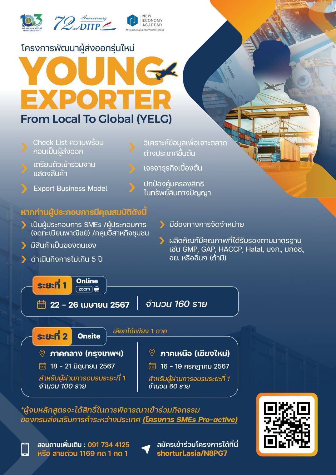 📢กลับมาแล้ว❗ กับการฝึกอบรมของผู้ประกอบการส่งออกรุ่นใหม่ที่ต้องการพัฒนาศักยภาพกับ โครงการพัฒนาผู้ส่งออกรุ่นใหม่ : Young Exporter from Local to Global (YELG) ประจำปี 2567 🥳✈️