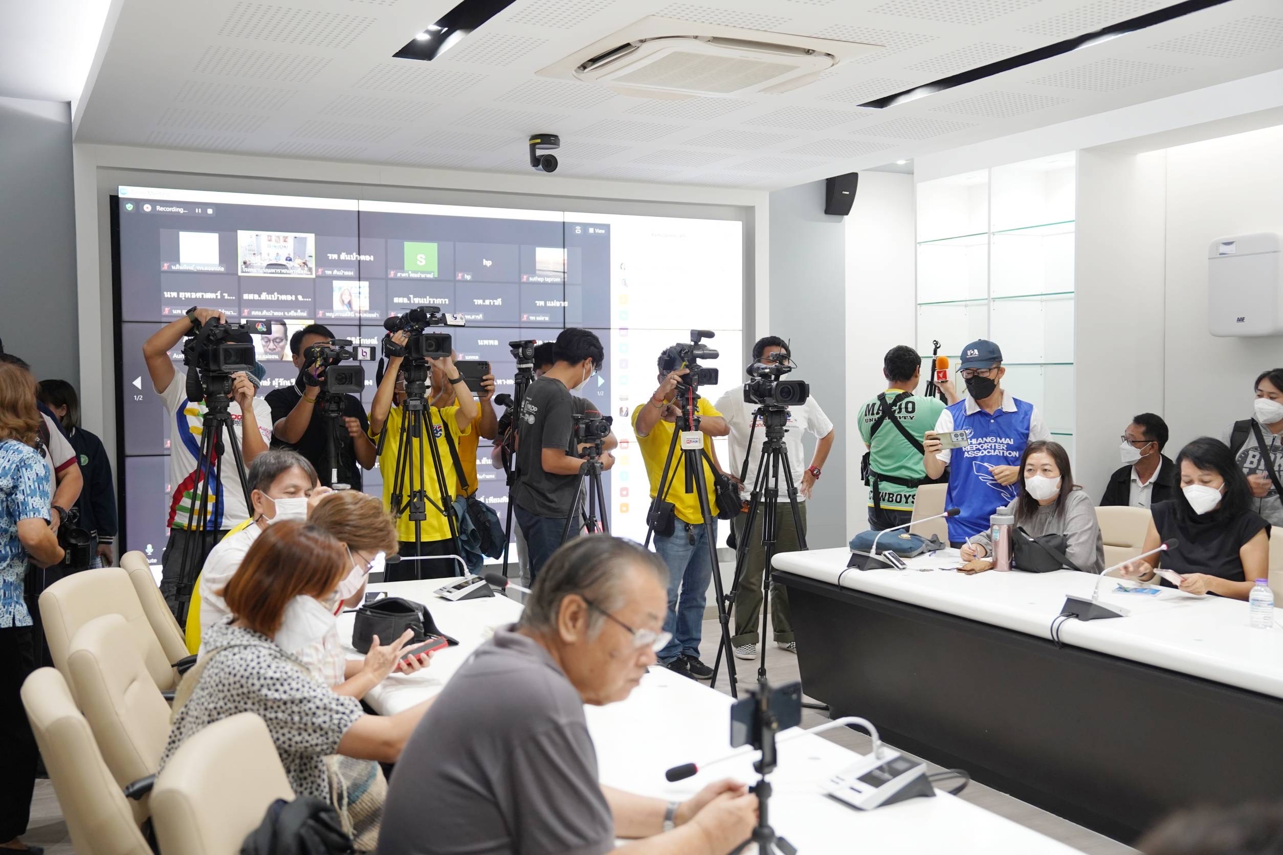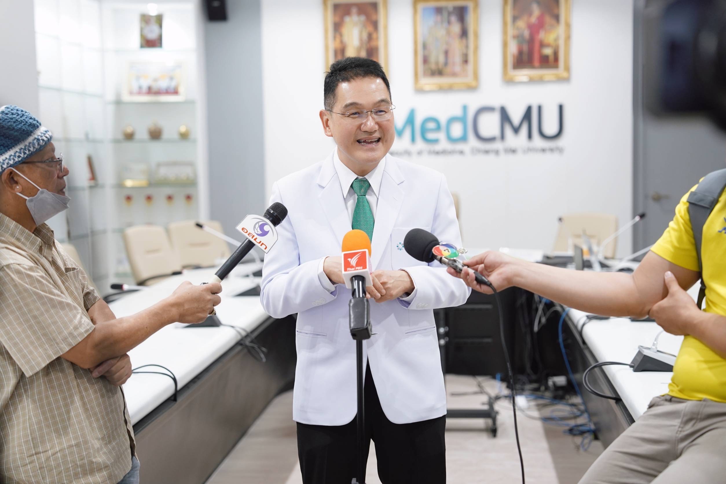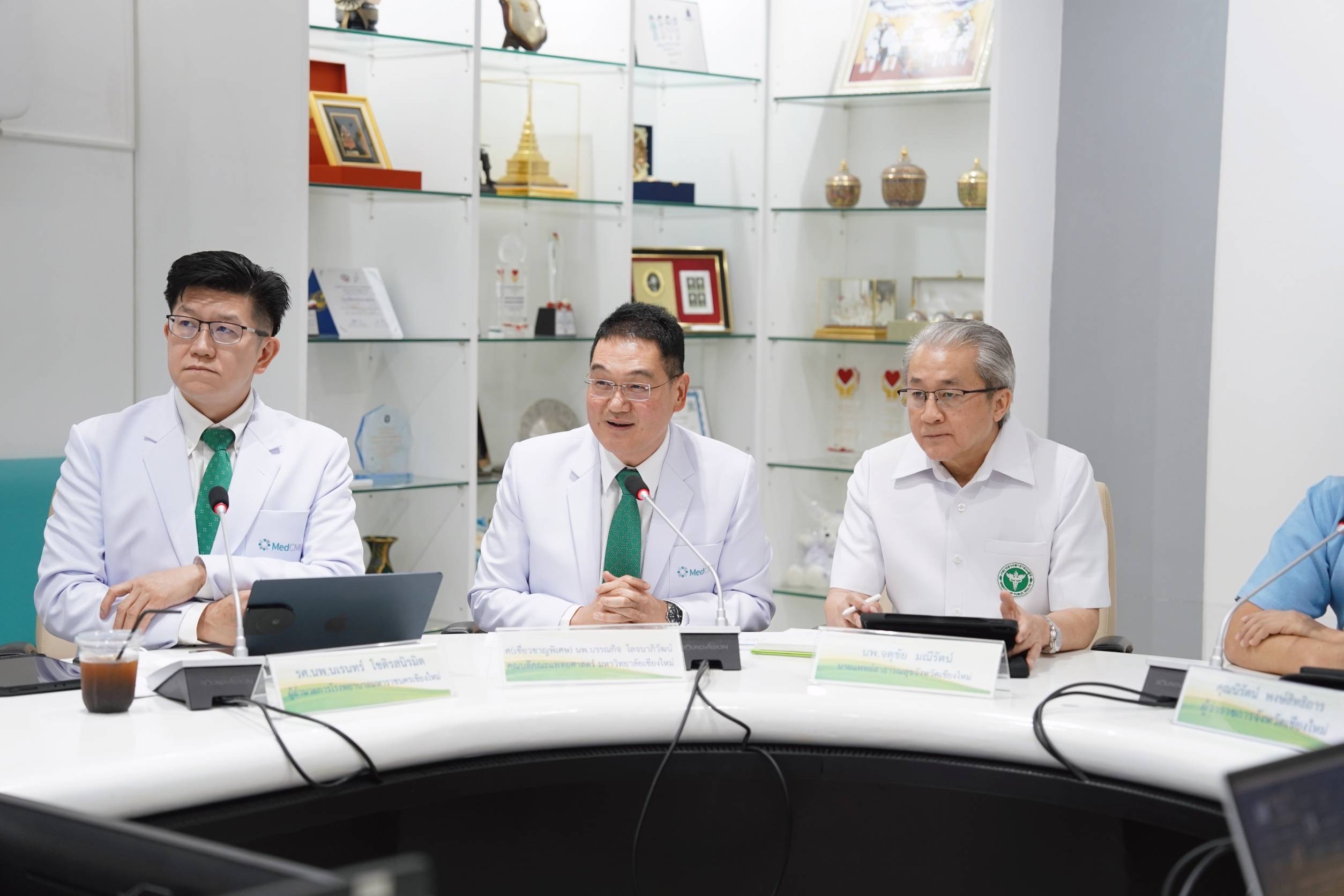 ศ.(เชี่ยวชาญพิเศษ)นพ.บรรณกิจ โลจนาภิวัฒน์ คณบดีคณะแพทยศาสตร์ มช. พร้อมด้วย รศ.นพ.นเรนทร์ โชติรสนิรมิต ผู้อำนวยการโรงพยาบาลมหาราชนครเชียงใหม่ ร่วมแถลงข่าว การปฏิบัติการทางการแพทย์และบริการสาธารณสุข เพื่อรักษาผู้ป่วยทางเดินหายใจ และกลุ่มเปราะบางที่ผ่านมา พร้อมให้ข้อมูลจํานวนผู้ป่วยในโรงพยาบาลมหาราชนครเชียงใหม่ และรายละเอียดของฝุ่น PM2.5 ที่มีผลต่อสุขภาพทั้งระยะสั้นและระยะยาว รวมทั้งมาตรการดูแลประชาชนและนักท่องเที่ยวในพื้นที่จังหวัดเชียงใหม่ โดยมีนายนิรัตน์ พงษ์สิทธิถาวร ผู้ว่าราชการจังหวัดเชียงใหม่ เป็นประธานในการแถลงข่าวฯ พร้อมด้วย นพ.จตุชัย มณีรัตน์ นายแพทย์สาธารณสุข จังหวัดเชียงใหม่ , นายพิชัย เลิศพงศ์อดิศร นายกองค์การบริหารส่วนจังหวัดเชียงใหม่ และนายดุสิต พงศาพิพัฒน์ หัวหน้าสำนักงานป้องกันและบรรเทาสาธารณภัย จังหวัดเชียงใหม่ ร่วมแถลงข่าวสื่อมวลชน ในวันที่ 8 เมษายน 2567 ณ ห้องประชุมบุญสม มาร์ติน คณะแพทยศาสตร์ มช.