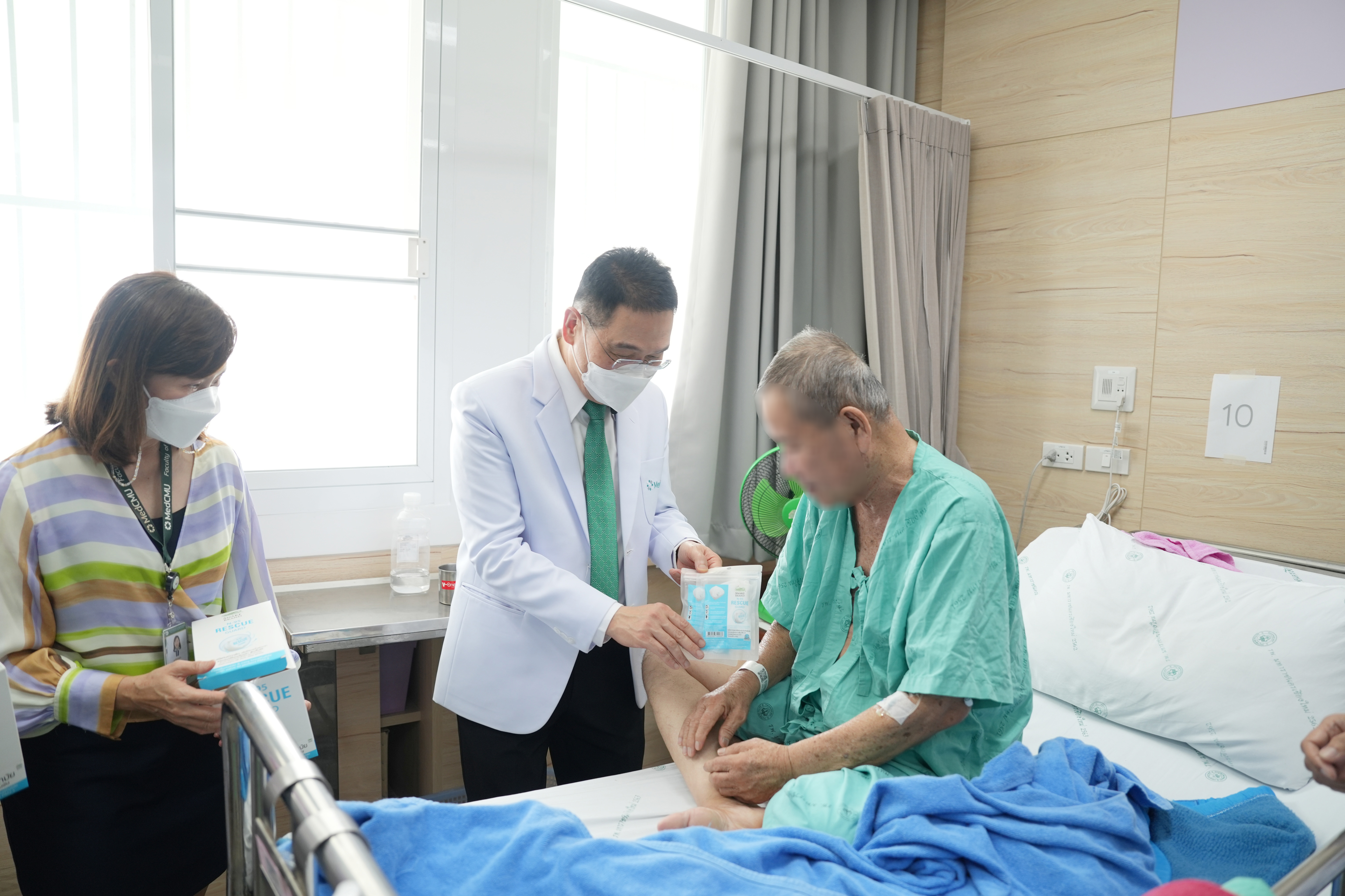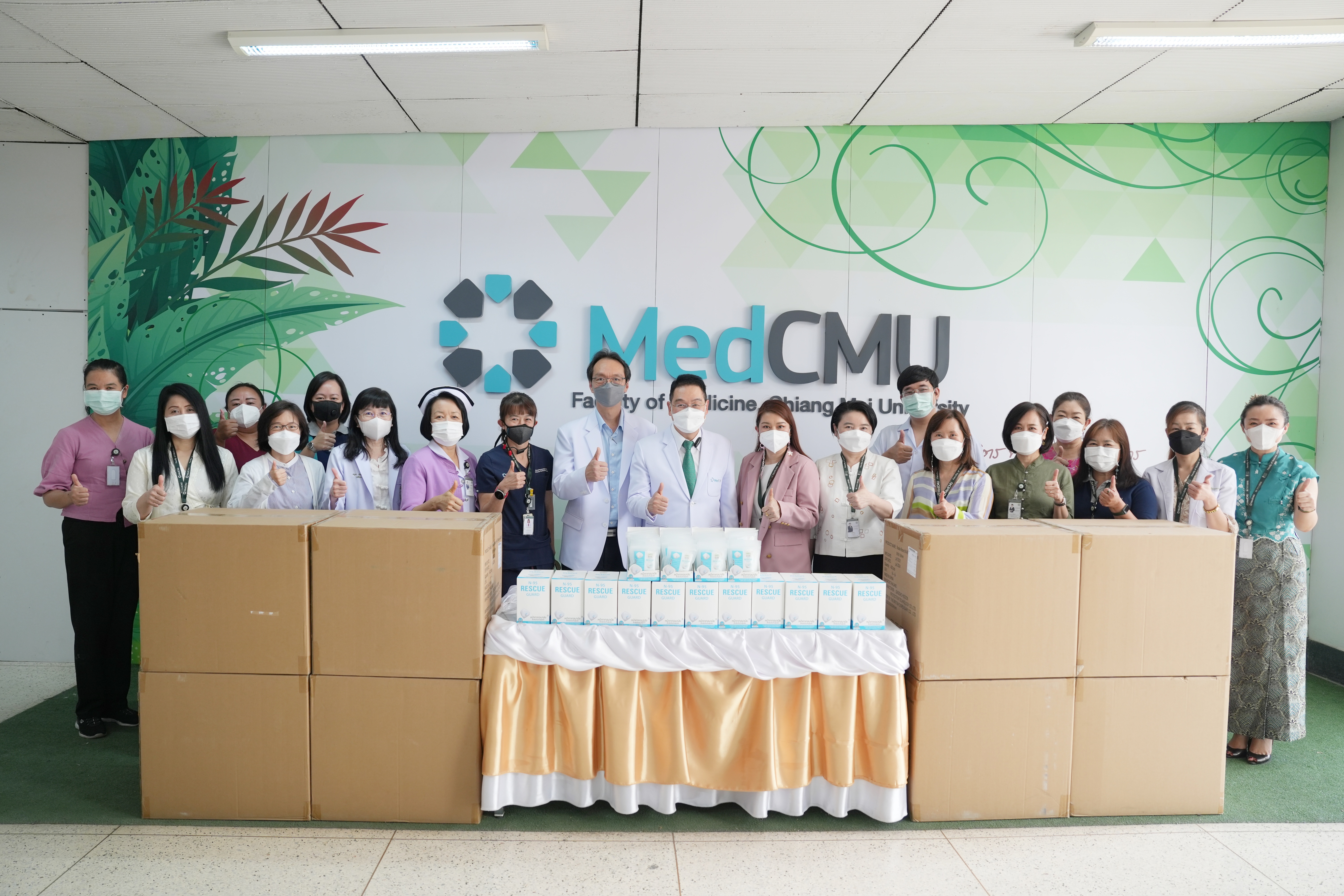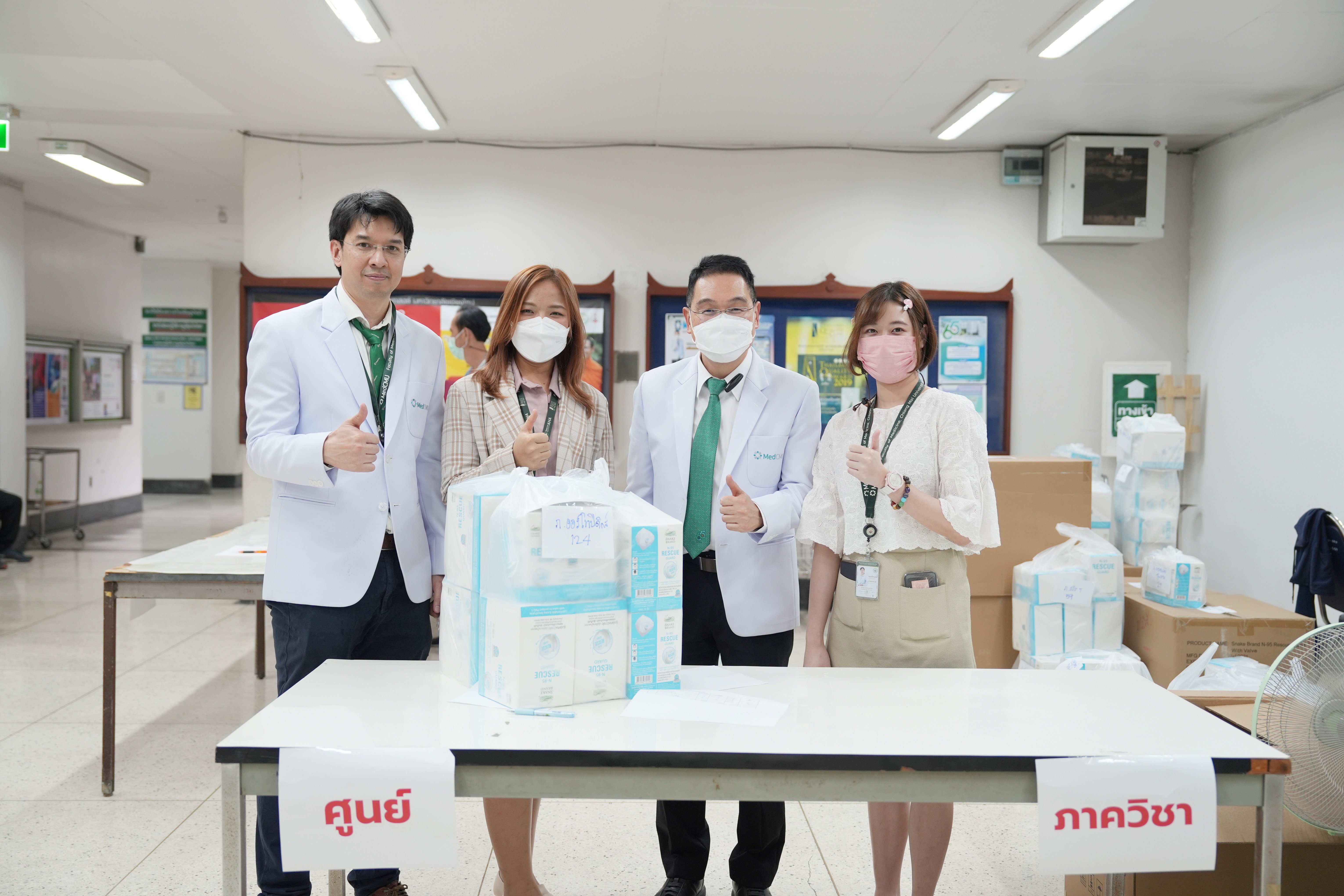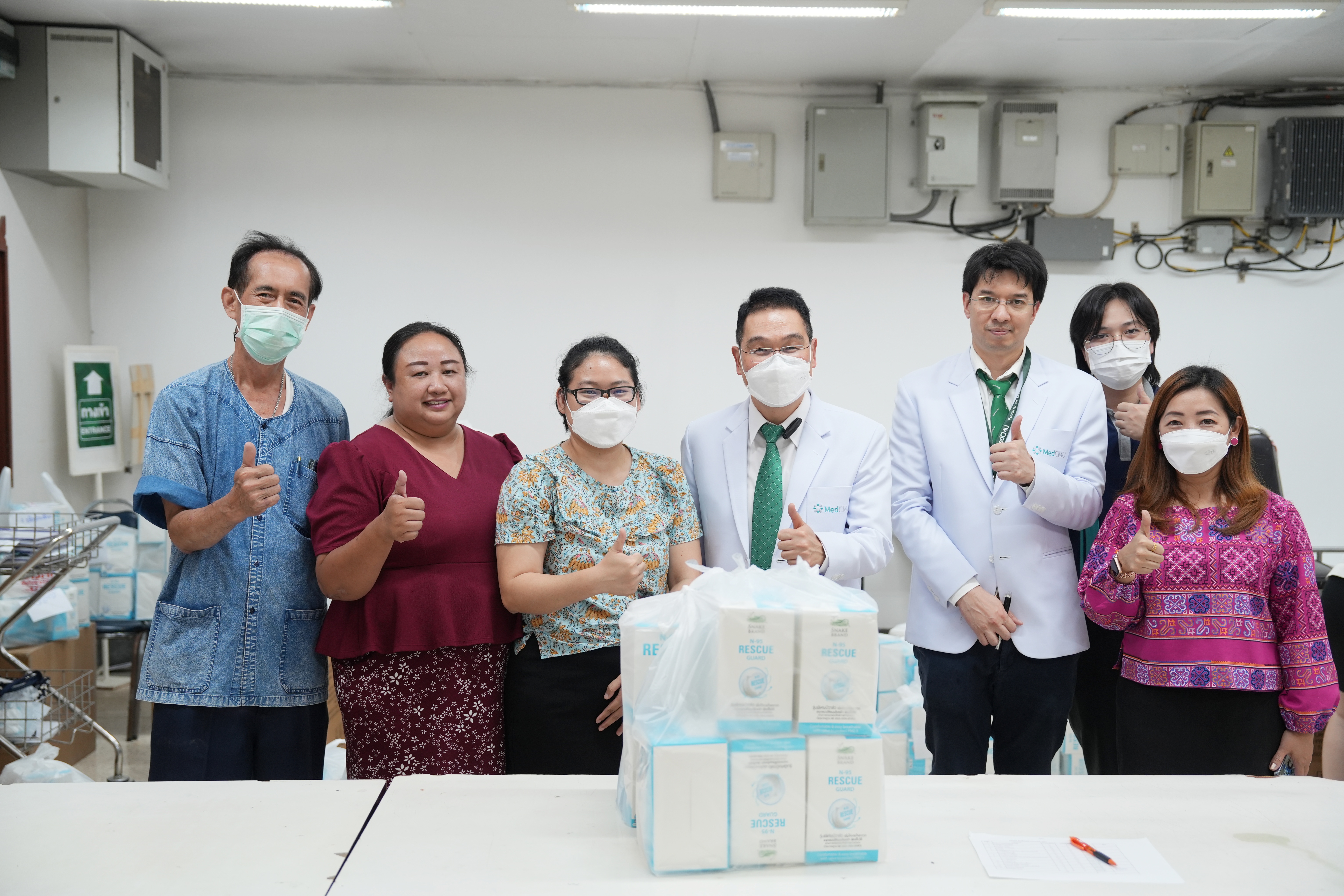 ศ.(เชี่ยวชาญพิเศษ)นพ.บรรณกิจ โลจนาภิวัฒน์ คณบดีคณะแพทยศาสตร์ มช. มอบหน้ากาก N95 ให้แก่ภาควิชา ฝ่ายงาน และผู้ป่วยในหอผู้ป่วย โรงพยาบาลมหาราชนครเชียงใหม่ เพื่อใช้ป้องกันฝุ่นควัน PM2.5 ในวันที่ 9 เมษายน 2567 ณ บริเวณโถงชั้น 1 อาคารบุญสม มาร์ติน และหอผู้ป่วยสุจิณฺโณ คณะแพทยศาสตร์ มช.
