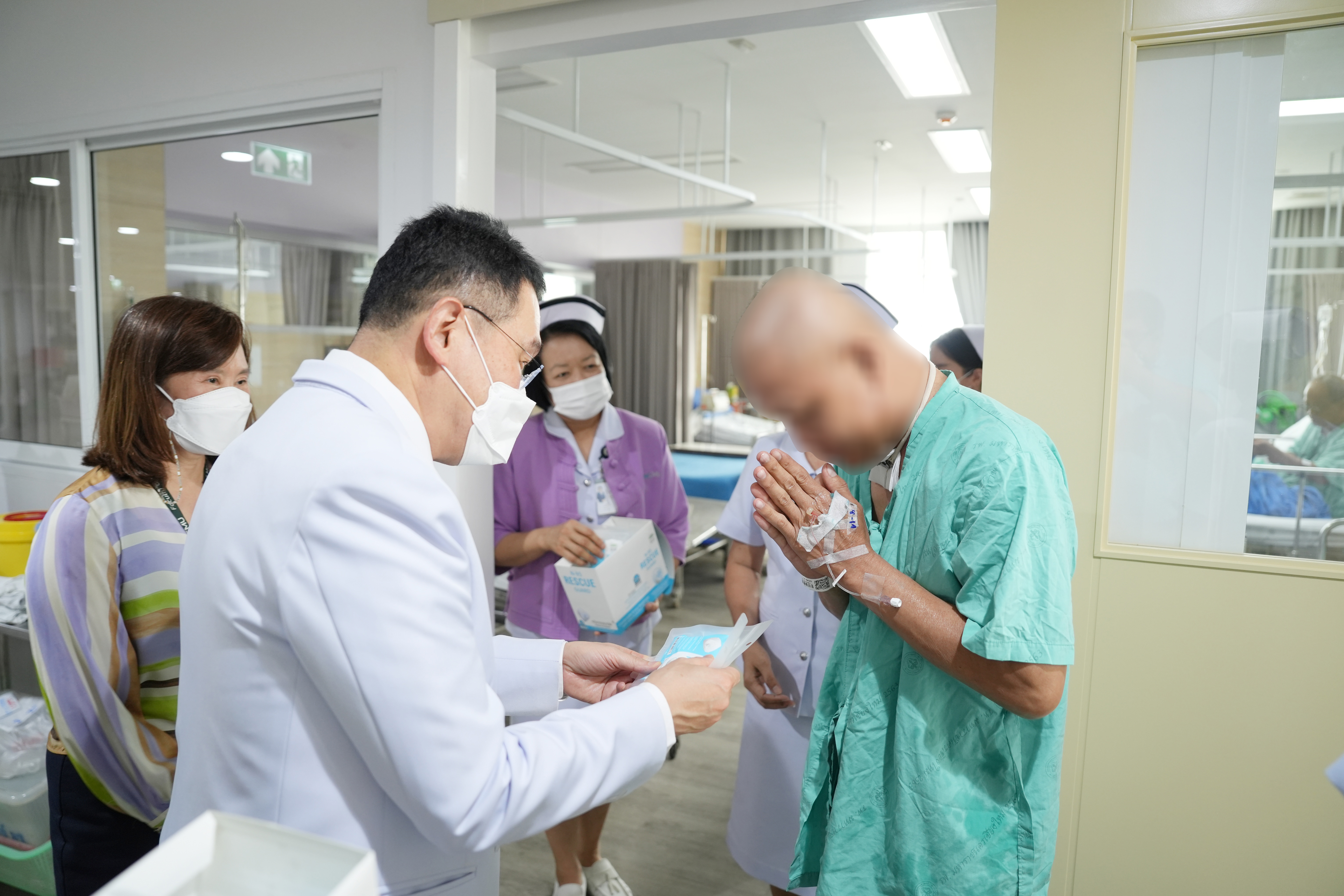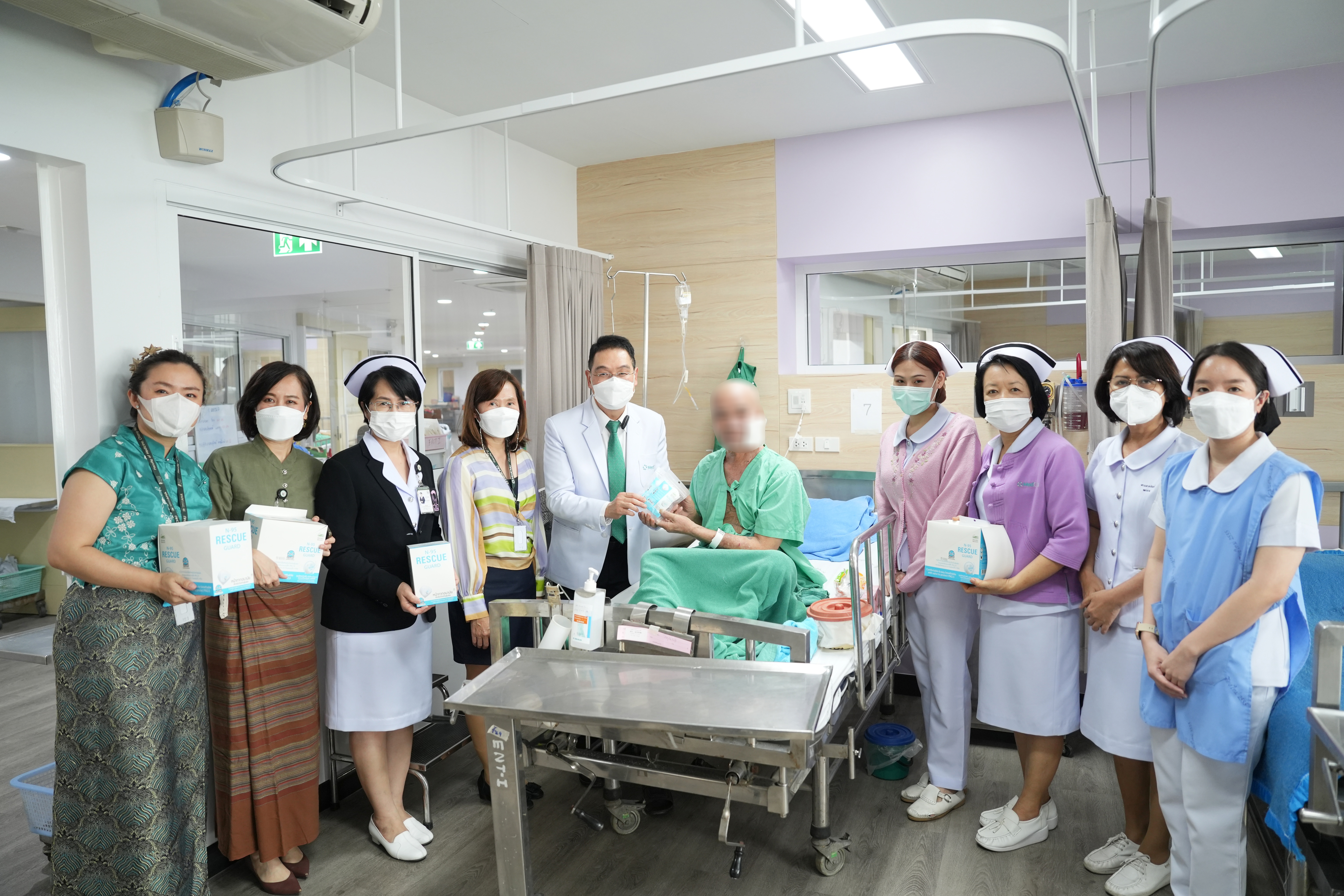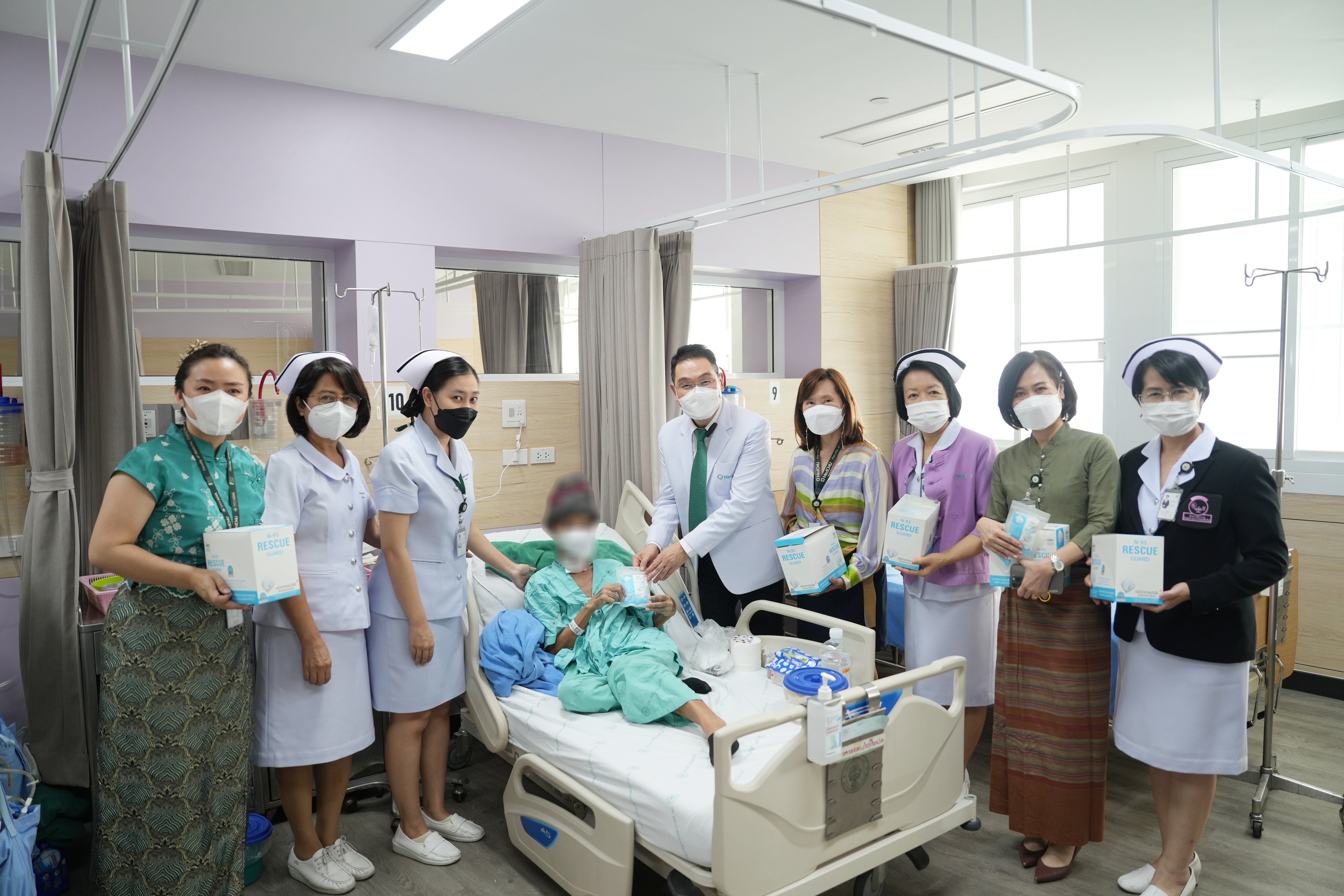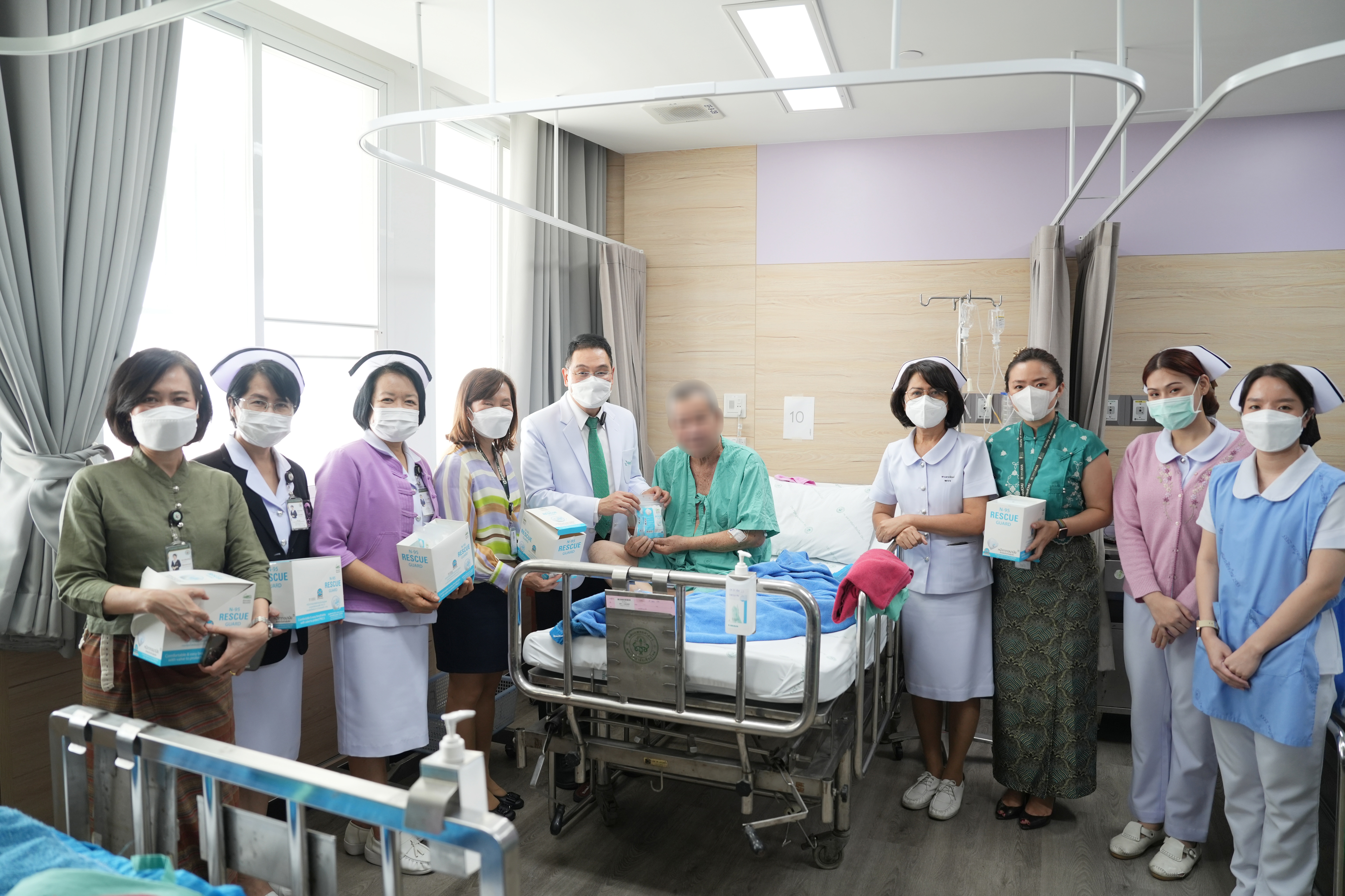 ศ.(เชี่ยวชาญพิเศษ)นพ.บรรณกิจ โลจนาภิวัฒน์ คณบดีคณะแพทยศาสตร์ มช. มอบหน้ากาก N95 ให้แก่ภาควิชา ฝ่ายงาน และผู้ป่วยในหอผู้ป่วย โรงพยาบาลมหาราชนครเชียงใหม่ เพื่อใช้ป้องกันฝุ่นควัน PM2.5 ในวันที่ 9 เมษายน 2567 ณ บริเวณโถงชั้น 1 อาคารบุญสม มาร์ติน และหอผู้ป่วยสุจิณฺโณ คณะแพทยศาสตร์ มช.