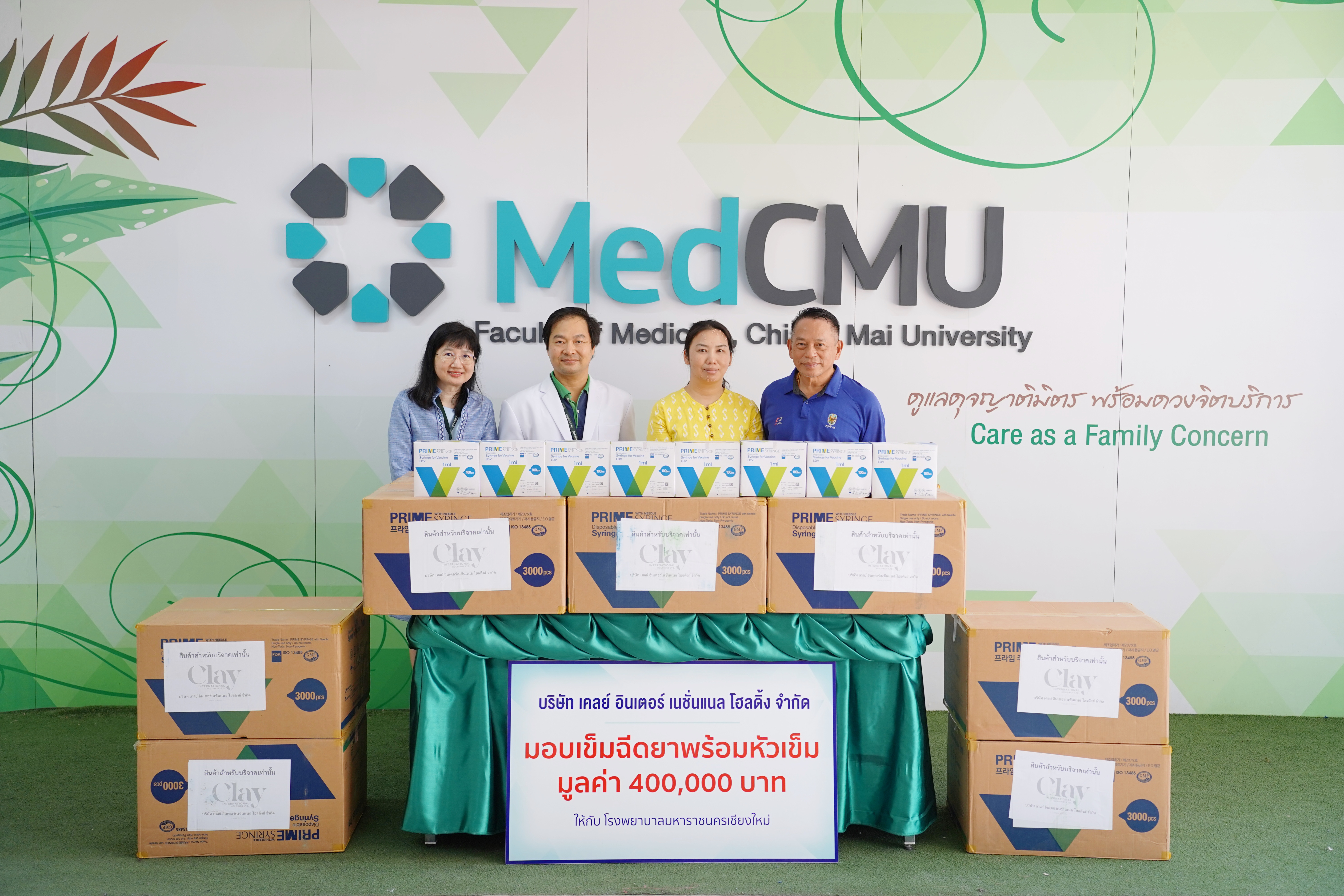 ผศ.นพ.สิทธิชา สิริอารีย์ รองผู้อำนวยการโรงพยาบาลมหาราชนครเชียงใหม่ พร้อมด้วย ดร.ภญ.อนุตรา ฆังตระกูล หัวหน้างานคลังเวชภัณฑ์และเภสัชสนเทศ ฝ่ายเภสัชกรรม โรงพยาบาลมหาราชนครเชียงใหม่ ร่วมรับมอบ เข็มฉีดยา ยี่ห้อ PRIME SYRINGE LDV 1 ml with needle 25 G จำนวน 100,000 ชิ้น มูลค่ารวม 400,000 บาท จาก บริษัท เคลย์ อินเตอร์เนชั่นแนล โยลดิ้งส์ จำกัดโดยมี พล.อ.ธวัชชัย ชวนสมบูรณ์ ที่ปรึกษาผู้ว่าการรถไฟแห่งประเทศไทย และคุณพิชามนชุ์ ชวนสมบูรณ์ เป็นผู้แทนมอบ เพื่อมอบให้กับโรงพยาบาลมหาราชนครเชียงใหม่ ในวันที่ 20 พฤษภาคม 2567 ณ บริเวณโถงชั้น 1 อาคารบุญสม มาร์ติน คณะแพทยศาสตร์ มช.