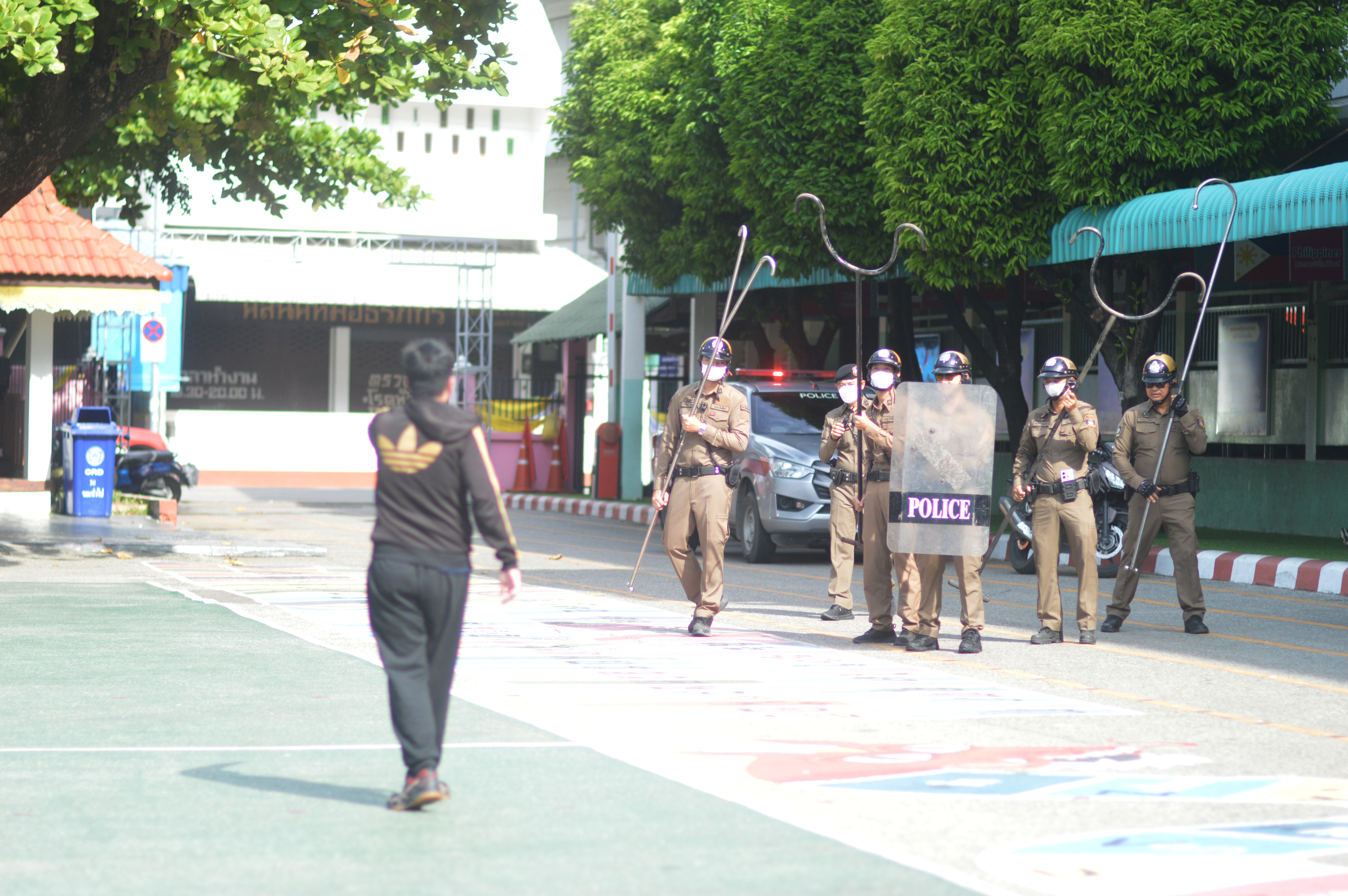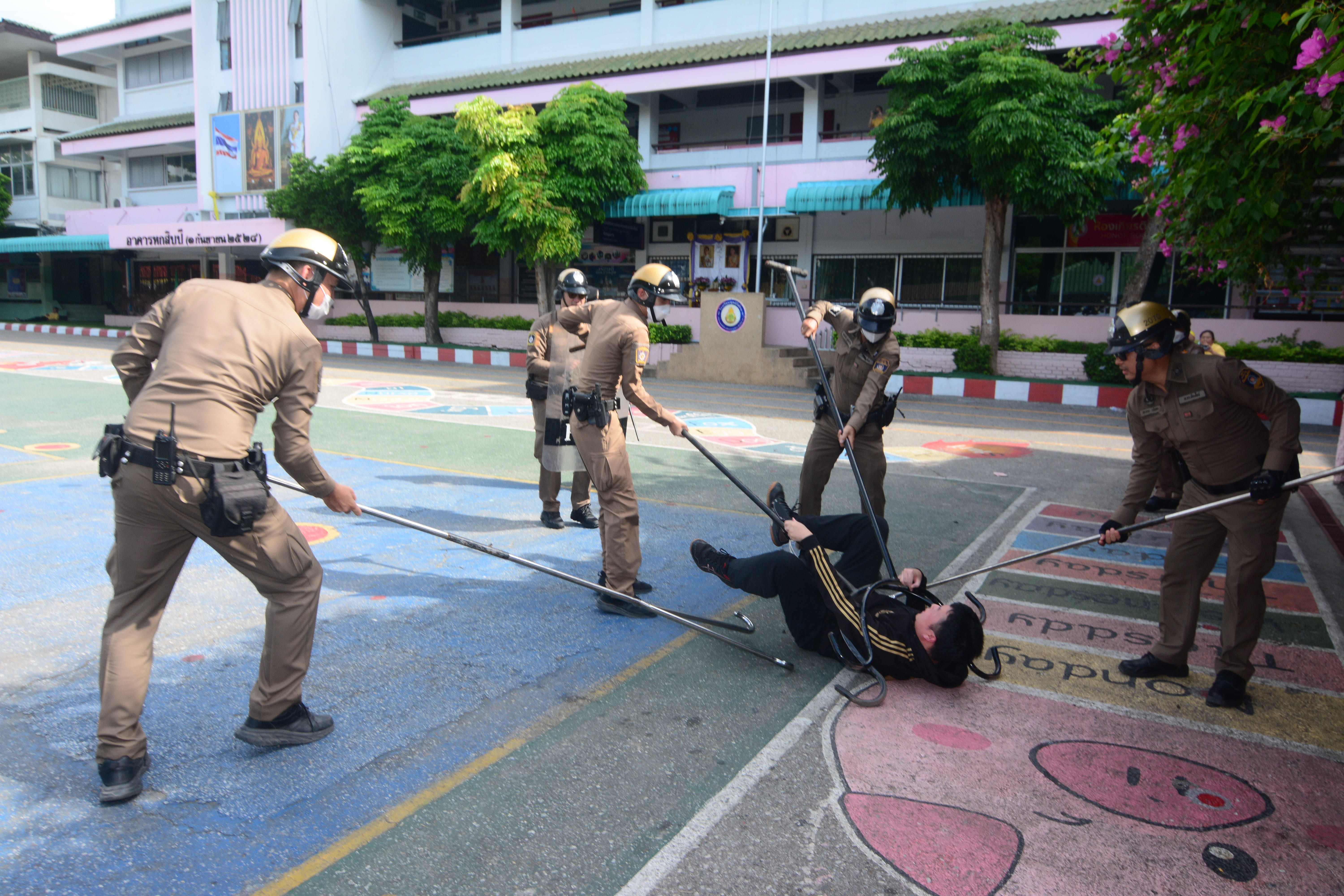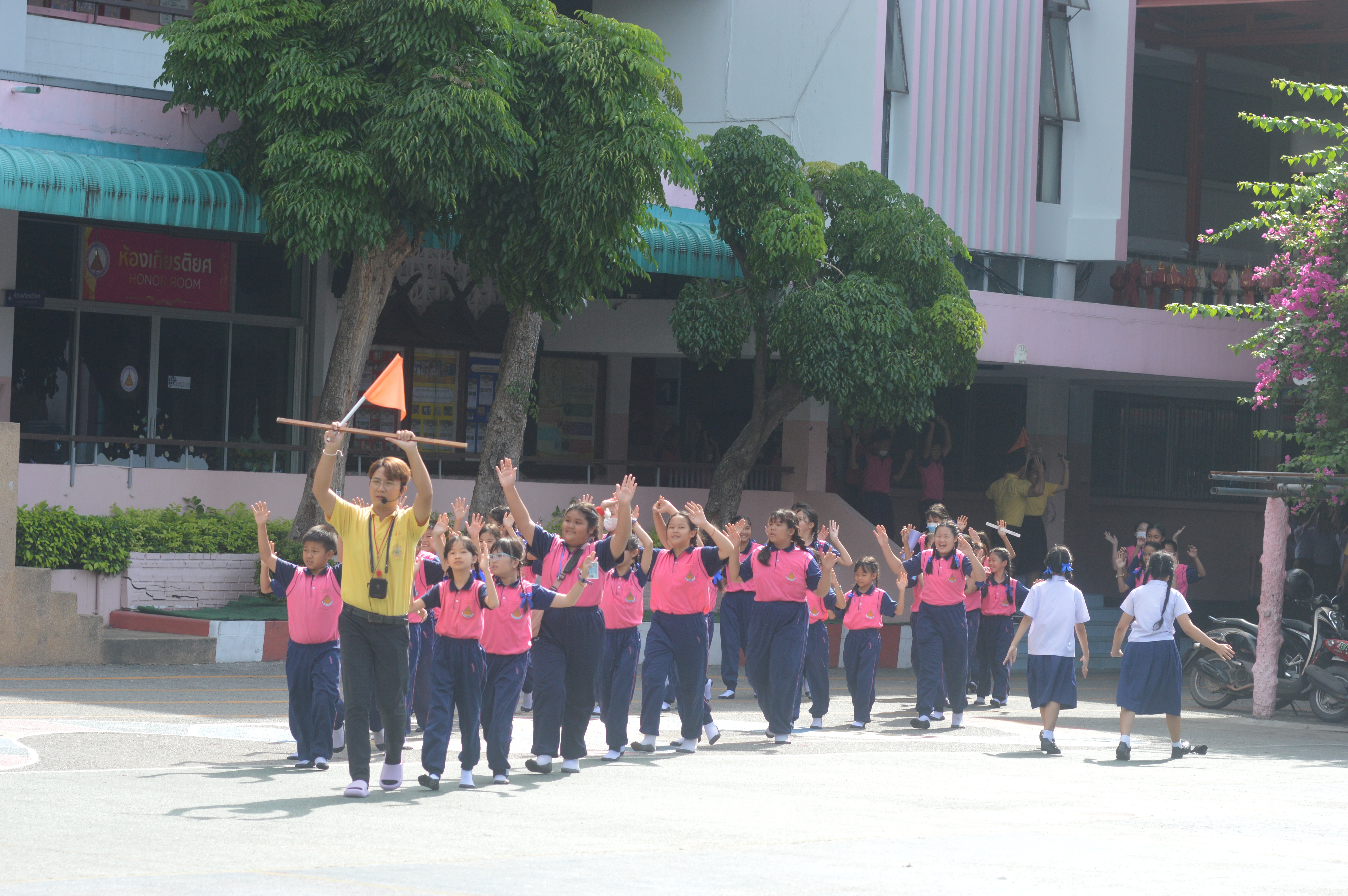เริ่มต้น คณะครูและนักเรียนร่วมฝึกซ้อมแผน ที่ บริเวณหน้าประตูโรงเรียนมีผู้ร้ายได้เข้ามาที่หน้าโรงเรียนอ้างว่า จะมาขอพบลูกที่โรงเรียน แต่ยามไม่ให้เข้าพบ จึงเกิดเหตุ..ยิง…เสียชีวิต คนร้ายมีอาวุธปืน นักเรียนวิ่งไปหลบซ่อน นักเรียนชั้น ป.6/1 หนีไปห้องศิลปะ ชั้น 2 อาคารพุทธิโศภน 91 ปี นักเรียนชั้นประถมปีที่ 6,ชั้น ป.6/2 หนีไปห้องดนตรี อาคารเชษฐา ชั้นป.6/3 หนีไปห้องคอมพิวเตอร์ อาคารเชษฐา,ชั้น ป.6/4 หนีไปห้องอาหารครู ชั้น 1 อาคาร 60 ปี ชั้นป.6/5 หนีไปห้องพยาบาล ชั้น 1 อาคาร 60 ปี แล้วคนร้ายเดินเข้ามาที่ภายโรงเรียนทำร้ายเจ้าหน้า เดินต่อไปตามอาคารเรียน