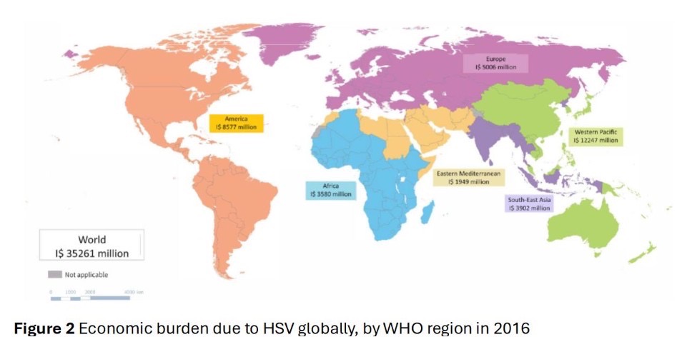 The study covers 194 countries categorized by WHO regions and World Bank income levels. It is the first ever global estimates of economic costs caused by genital herpes infections and their related complications. The research estimates the global economic impact of genital herpes and suggests the urgent needs for the prevention of herpes transmission. The key findings reveal that every year genital herpes infections lead to billions of international dollars (I$) in health care expenditures and productivity losses. Thus there is a critical need for accelerated development of effective HSV vaccines. Current treatment, such as antiviral drugs, can alleviate symptoms but do not prevent transmission or recurrence of the infection. A safe and efficacious vaccine could significantly reduce the health and economic burden of HSV infections globally.