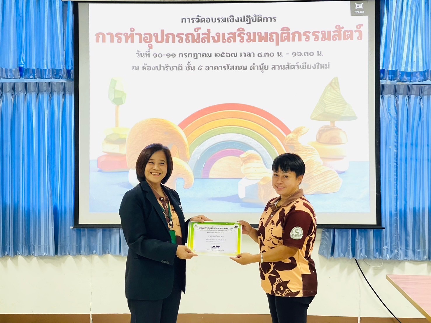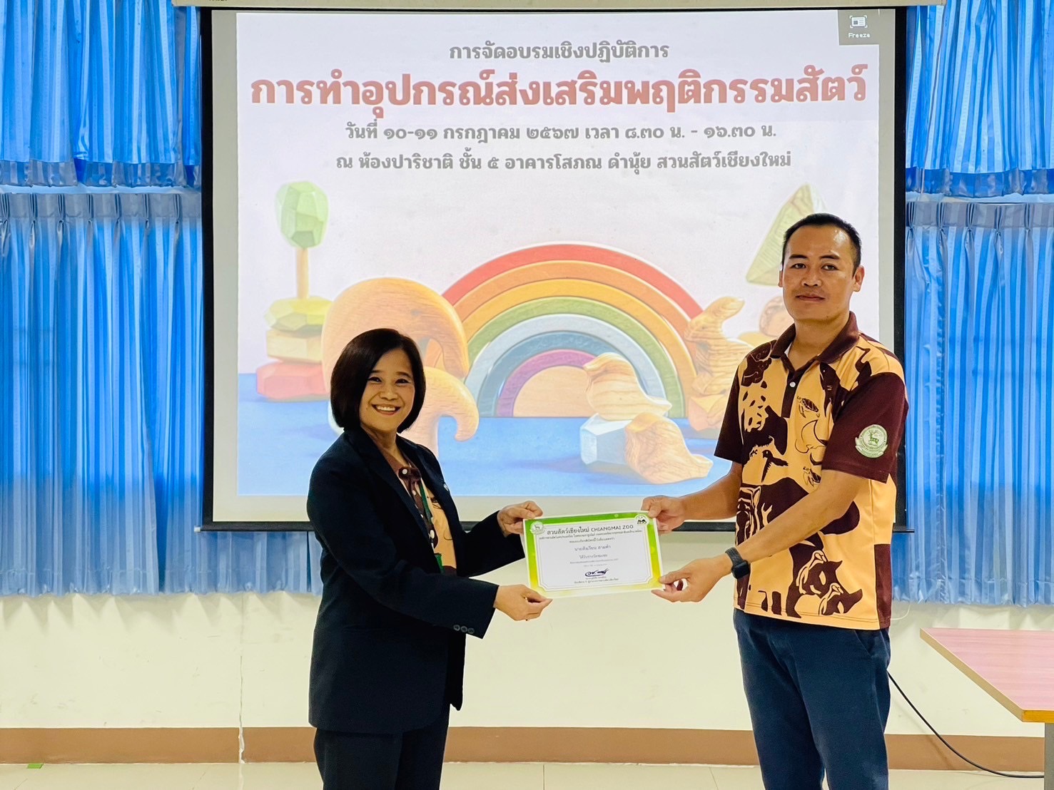 ในการนี้ มีพิธีมอบเกียรติบัตรพนักงานดีเด่น ด้านการส่งเสริมพฤติกรรมสัตว์ประจำปี 2567 โดยพิจารณาจากความถี่ในการทำกิจกรรมตามแผนการส่งเสริมพฤติกรรมสัตว์ และการส่งรายงาน ผ่านทางไลน์กลุ่ม Animal Enrichment สวนสัตว์เชียงใหม่ ประกอบไปด้วย รางวัลพนักงานดีเด่นอันดับ 1 สามารถทำกิจกรรมตามแผนการส่งเสริมพฤติกรรมสัตว์ได้มากว่า 80 % รางวัลพนักงานดีเด่นอันดับ 2 สามารถทำกิจกรรมตามแผนการส่งเสริมพฤติกรรมสัตว์ได้ 70-79 % รางวัลพนักงานดีเด่นอันดับ 3 สามารถทำกิจกรรมตามแผนการส่งเสริมพฤติกรรมสัตว์ได้ 60-69 % และรางวัลชมเชยด้านการส่งเสริมพฤติกรรสัตว์ รับมอบโดย ผู้ช่วยผู้อำนวยการสวนสัตว์เชียงใหม่ พร้อมกล่าวปิดอย่างเป็นทางการ ในเวลา 15.00 น.