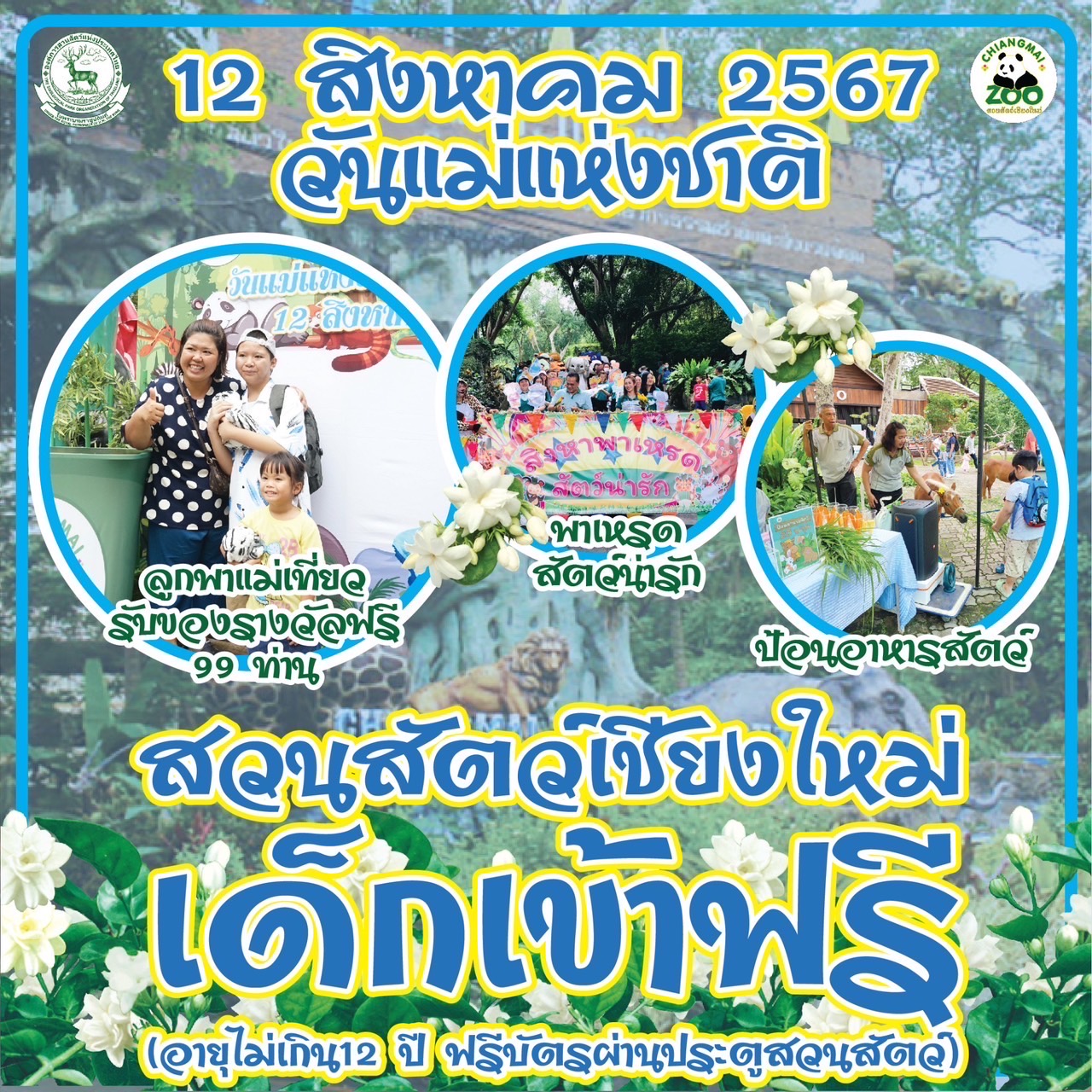นายวุฒิชัย ม่วงมัน ผู้อำนวยการสวนสัตว์เชียงใหม่ เผยว่า ตามที่ องค์การสวนสัตว์แห่งประเทศไทย ในพระบรมราชูปถัมภ์ ฉลองวันแม่แห่งชาติ เปิดให้ผู้สูงอายุและเด็กอายุไม่เกิน 12 ปี เข้าชม 7 สวนสัตว์ฟรี!! วันแม่แห่งชาติ วันที่ 12 สิงหาคม 2567 เนื่องในวันคล้ายวันพระราชสมภพของสมเด็จพระนางเจ้าสิริกิติ์พระบรมราชินีนาถ พระบรมราชชนนีพันปีหลวง พิเศษสำหรับนักท่องเที่ยว 99 คู่แรก (ลูกพาแม่ พ่อพาลูก ปู่ย่าตายายพาหลาน) รับของที่ระลึกพร้อมกับเล่นเกมทายใจสนุก ๆ กับพี่มาสคอตสัตว์น่ารัก ณ บริเวณจุด Welcome Center และในเวลา 11.00 น. ณ บริเวณมินิซู จะพบกับขบวน “สิงหาพาเหรดสัตว์น่ารัก” ซึ่งจะประกอบด้วยเหล่าบรรดามาสคอตสัตว์ สัตว์น่ารัก กว่า 50 ตัว ที่นำออกมาให้นักท่องเที่ยวได้ถ่ายรูป และป้อนอาหารได้อย่างใกล้ชิด เช่น นกมาคอร์ฟ้าอกเหลืองสีสันสดใส, นกค๊อกคาเทลหลากสี, แพะแคระจอมซน, ม้าแคระเชทแลนท์ขนสวย, กระต่ายน้อยซุกชน, เจ้าอ้นผู้น่ารัก, ลูกหมีขอ(น้องลาบูบู้), นกเพนกวินเริงร่า และเหล่าสัตว์น่ารักอื่นๆ อีกมากมาย