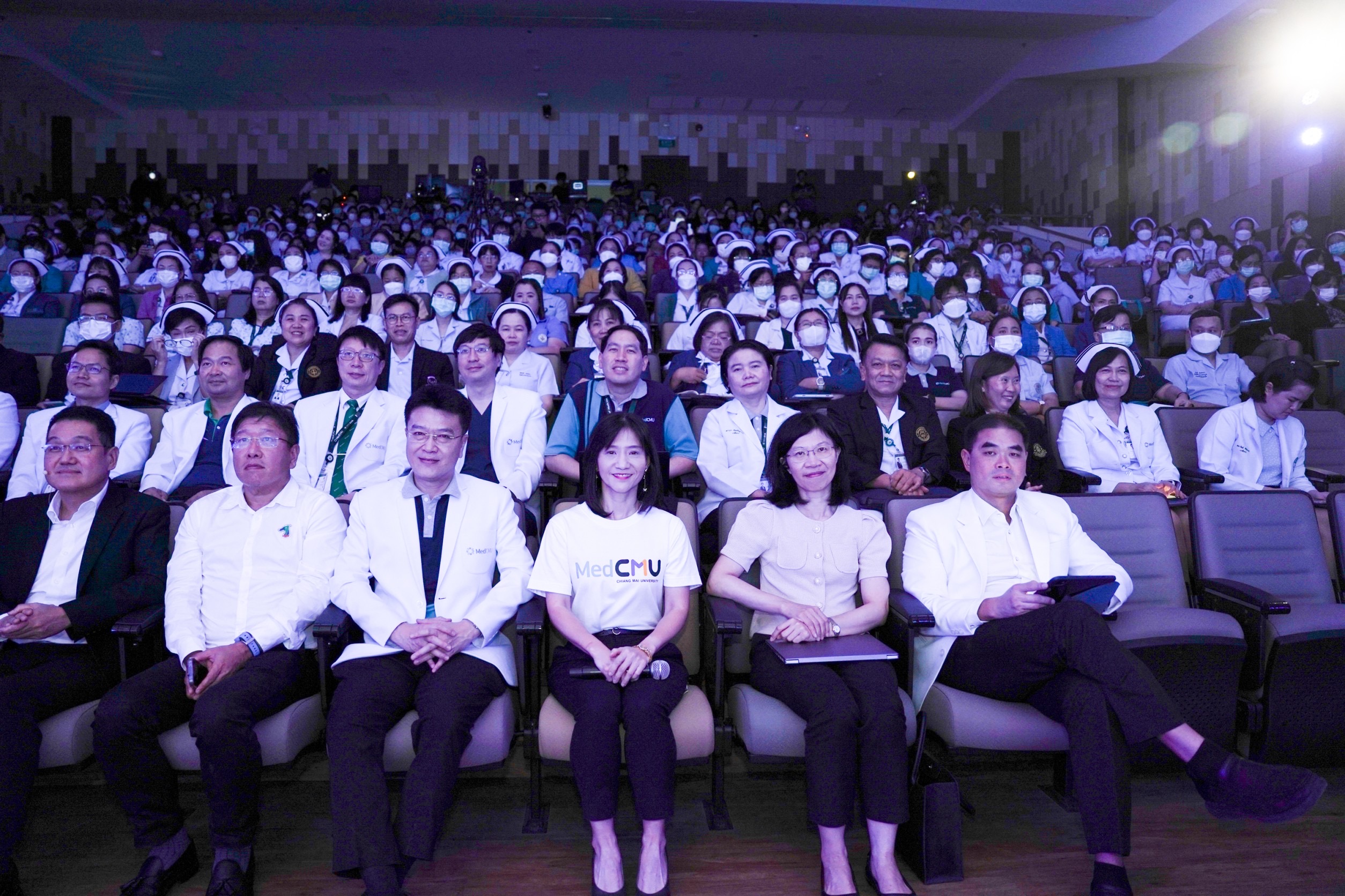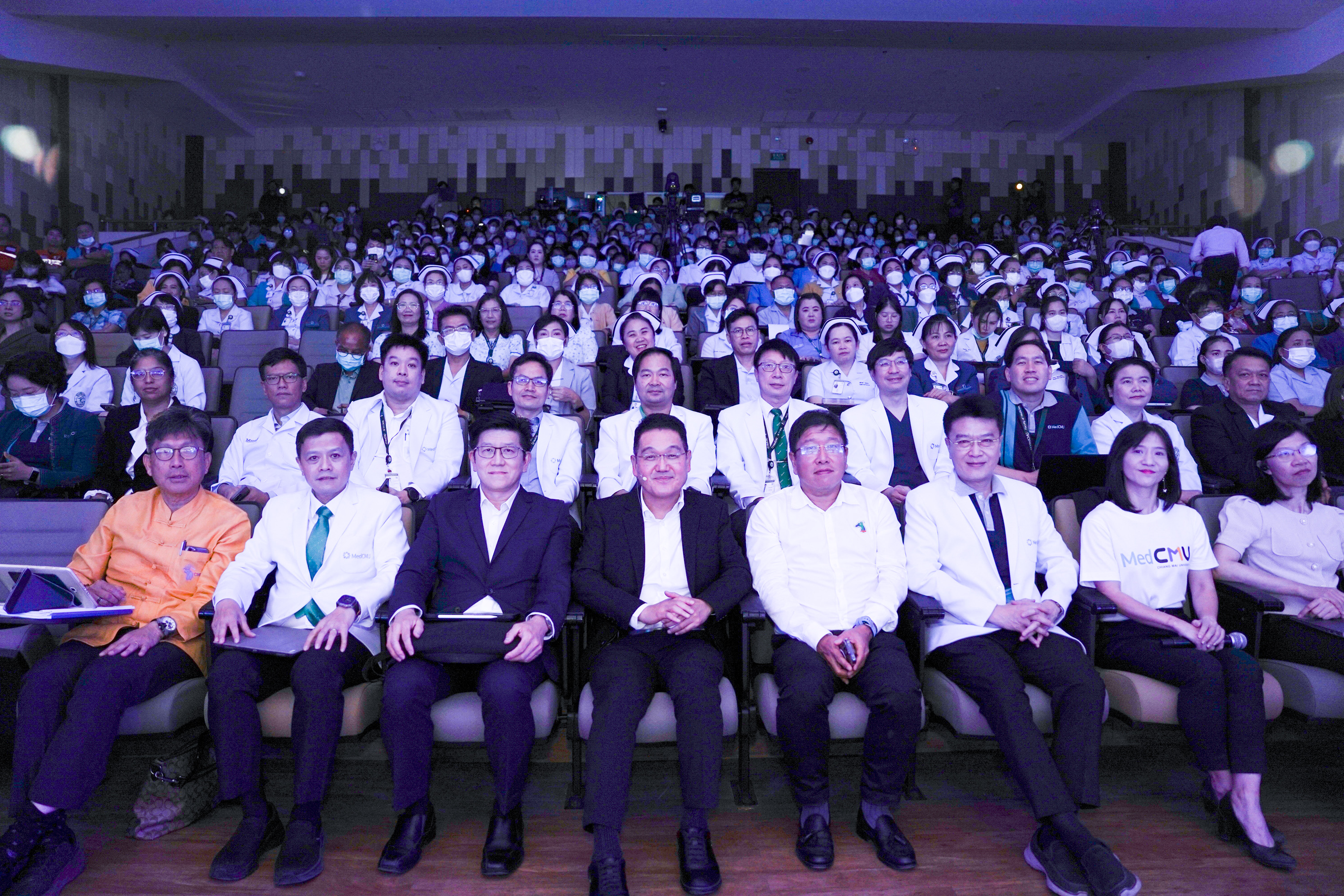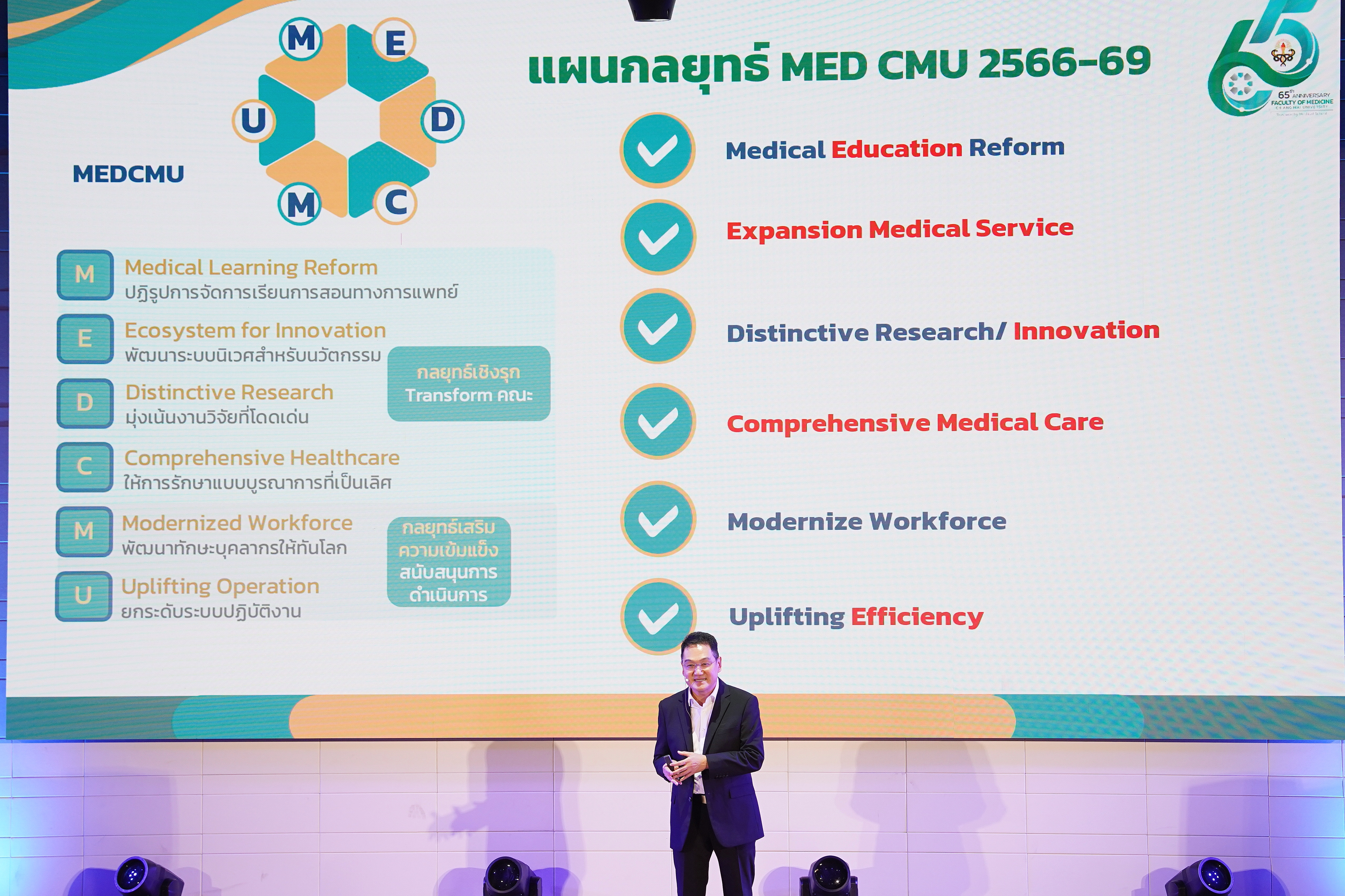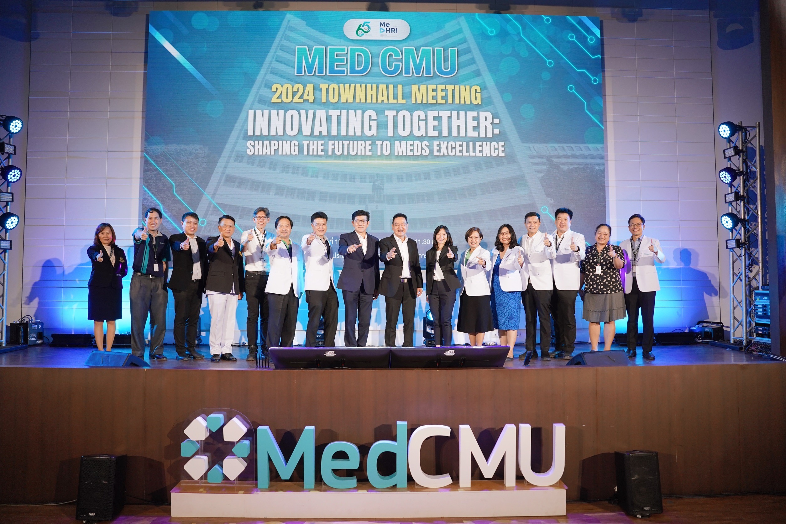 ศ.(เชี่ยวชาญพิเศษ) นพ.บรรณกิจ โลจนาภิวัฒน์ คณบดีคณะแพทยศาสตร์ มช. เป็นประธานในพิธีเปิด โครงการ MEDCMU Townhall: Innovating Together – Shaping the Future to MEDS Excellence พร้อมบรรยายพิเศษ เรื่อง MEDCMU: VMV and Strategic Objectives update, ความภูมิใจในความสำเร็จของเรา MEDCMU Celebrating Milestones โดยมีบุคลากรเข้าร่วม onsite และ online จำนวนกว่า 700 คน โดยมี รศ.นพ.นเรนทร์ โชติรสนิรมิต ผู้อำนวยการ โรงพยาบาลมหาราชนครเชียงใหม่ บรรยายเรื่อง นโยบายด้านการบริการสุขภาพโรงพยาบาลมหาราชฯ พร้อมด้วย ผศ.นพ.สารนาถ ออรพินท์ รองคณบดีคณะแพทยศาสตร์ มช. บรรยายและประกาศนโยบาย Carbon neutral policy, ผศ.นพ.กฤษณ์ ขวัญเงิน รองคณบดีคณะแพทยศาสตร์ มช. บรรยายเรื่อง Monitoring System (OC dashboard), ผศ.นพ.เศรษฐพงศ์ บุญศรี รองคณบดีคณะแพทยศาสตร์ มช. บรรยายเรื่อง KM platform และ รศ.พญ.สุรินทร์พร ลิขิตเสถียร รองคณบดีคณะแพทยศาสตร์ มช. บรรยายเรื่อง Empowering our people ในงานมีกิจกรรม Innovation Wall ให้ผู้เข้าร่วมเขียนไอเดืยนวัตกรรม สิ่งที่อยากให้คณะฯ ทำเพื่อมุ่งสู่นวัตกรรมของหน่วยงานเพื่อมุ่งสู่ MEDS Excellence ในโอกาสเดียวกัน ศ.(เชี่ยวชาญพิเศษ) นพ.บรรณกิจ โลจนาภิวัฒน์ คณบดีคณะแพทยศาสตร์ มช. แสดงความขอบคุณบุคลากร และหน่วยงานที่สนับสนุนการพัฒนาคุณภาพคณะแพทยศาสตร์ มช. ในวันที่ 19 สิงหาคม 2567 ณ ห้องประชุม ชั้น 2 อาคารเรียนและปฏิบัติการ 50 ปี คณะแพทยศาสตร์ มช.