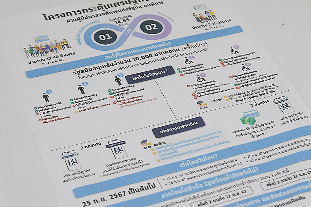 วันที่ 20 กันยายน 2567 ผู้สื่อข่าวรายงานว่า ผู้พิการจังหวัดเชียงใหม่ ต่างมายังศูนย์บริการผู้พิการจังหวัดเชียงใหม่ สำนักงานพัฒนาสังคมและความมั่นคงของมนุษย์จังหวัดเชียงใหม่ ณ ศาลากลางจังหวัดเชียงใหม่ เพื่อต่อบัตรเนื่องจากหมดอายุและทำบัตรใหม่ ซึ่ง กรมบัญชีกลาง สำนักงบประมาณ และกระทรวงการคลัง จะใช้ฐานข้อมูลดังกล่าวโอนเงินได้ทันที โดยไม่ต้องลงทะเบียนเงินดิจิทัลบนแอปฯ ทางรัฐ โดยจะเริ่มโอนเงิน 10,000 บาท ให้กลุ่มผู้พิการจำนวน 2.1 ล้านคน ในวันที่ 25 ก.ย. 67
