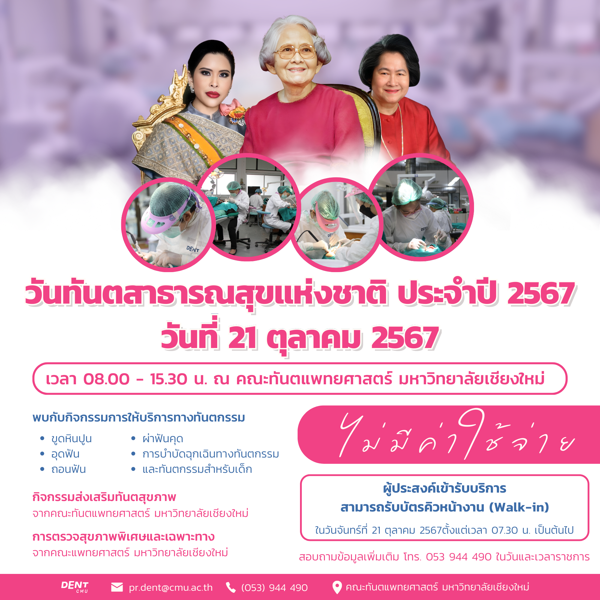 คณะทันตแพทยศาสตร์ มหาวิทยาลัยเชียงใหม่ ขอเชิญชวนประชาชนทุกท่าน เข้าร่วมกิจกรรมวันทันตสาธารณสุขแห่งชาติ ประจำปี 2567